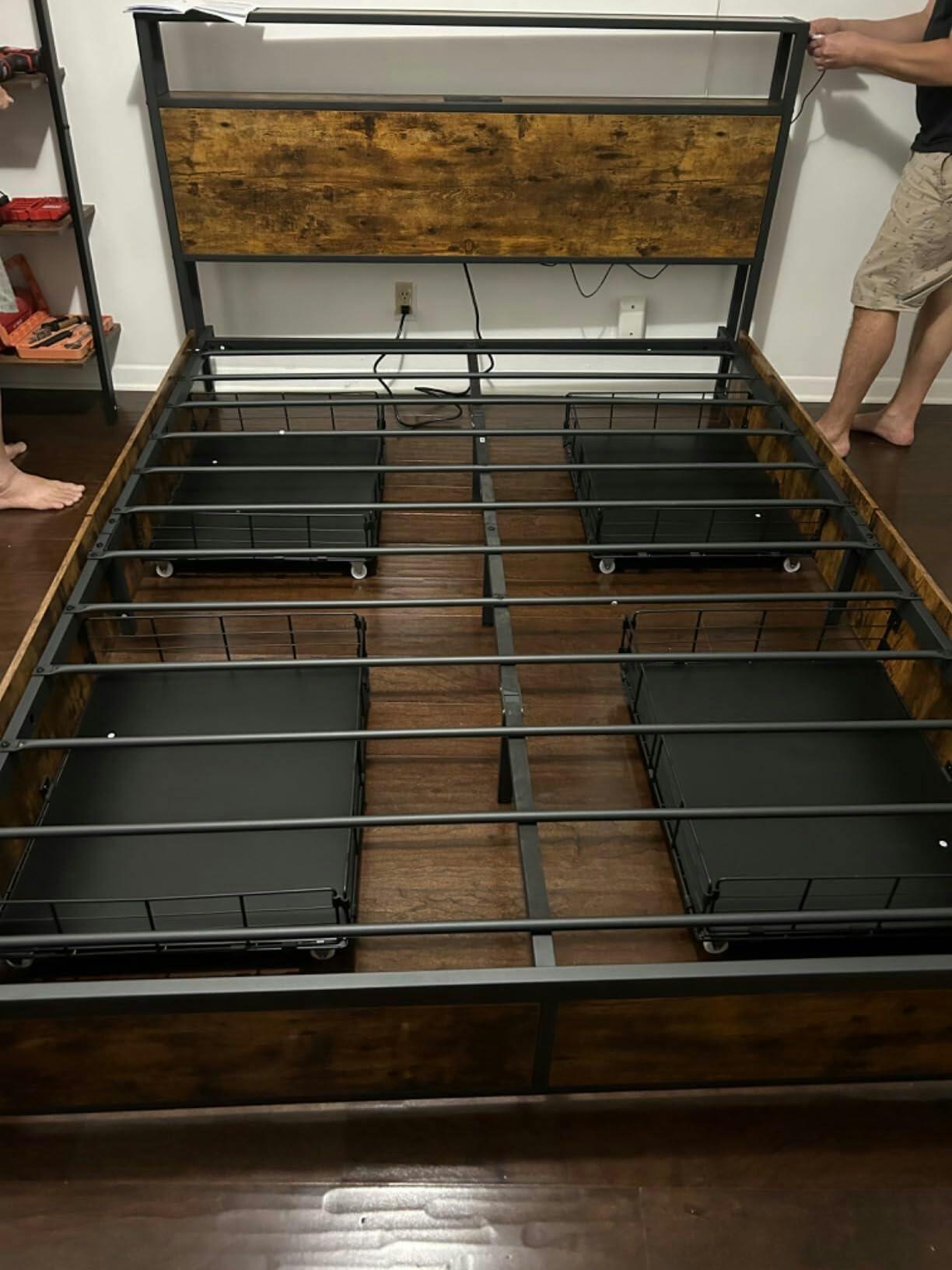 - Industrial Style & Easy Assembly: The combination of wood grain panels and metal frames gives the bed frame an industrial feel. It is suitable for use in master room, guestroom, and hotel. With the detailed manual and numbered parts, you'll set up the bed base with ease. Plus, the drawers can be latched onto the bed easily thanks to the drawer fixture.