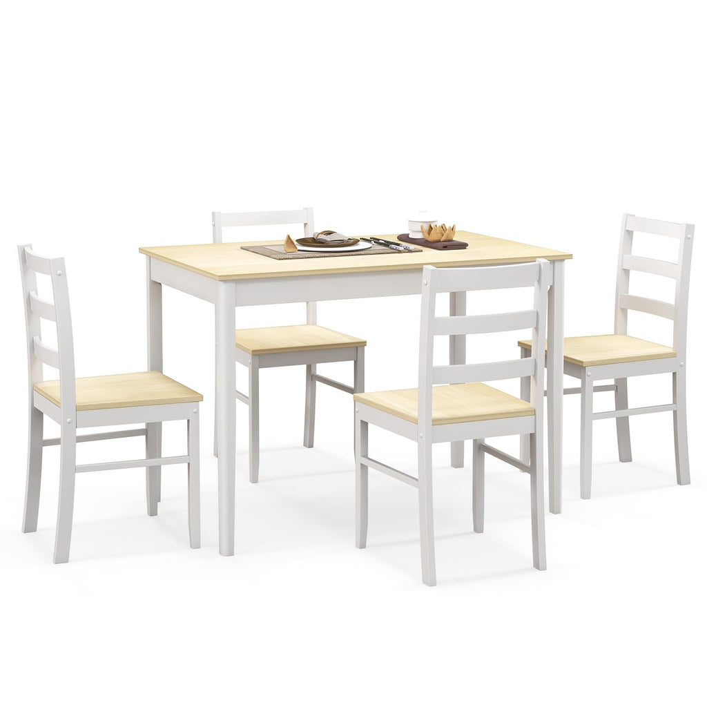 The dining table and chair frames are constructed of rubber wood to provide a sturdy and reliable dining experience that will stand the test of time. The high-quality MDF tabletop with acacia wood veneers not only adds a touch of elegance but also ensures resistance to water and stains, making cleaning a breeze. The dining chairs are designed to neatly tuck underneath the table, offering a smart solution for optimizing space in smaller dining areas. Boasting ladder-shaped backrests, the 5 piece dinette table set serves as a timeless decoration for various dining occasions, including dining room, kitchen and restaurant.