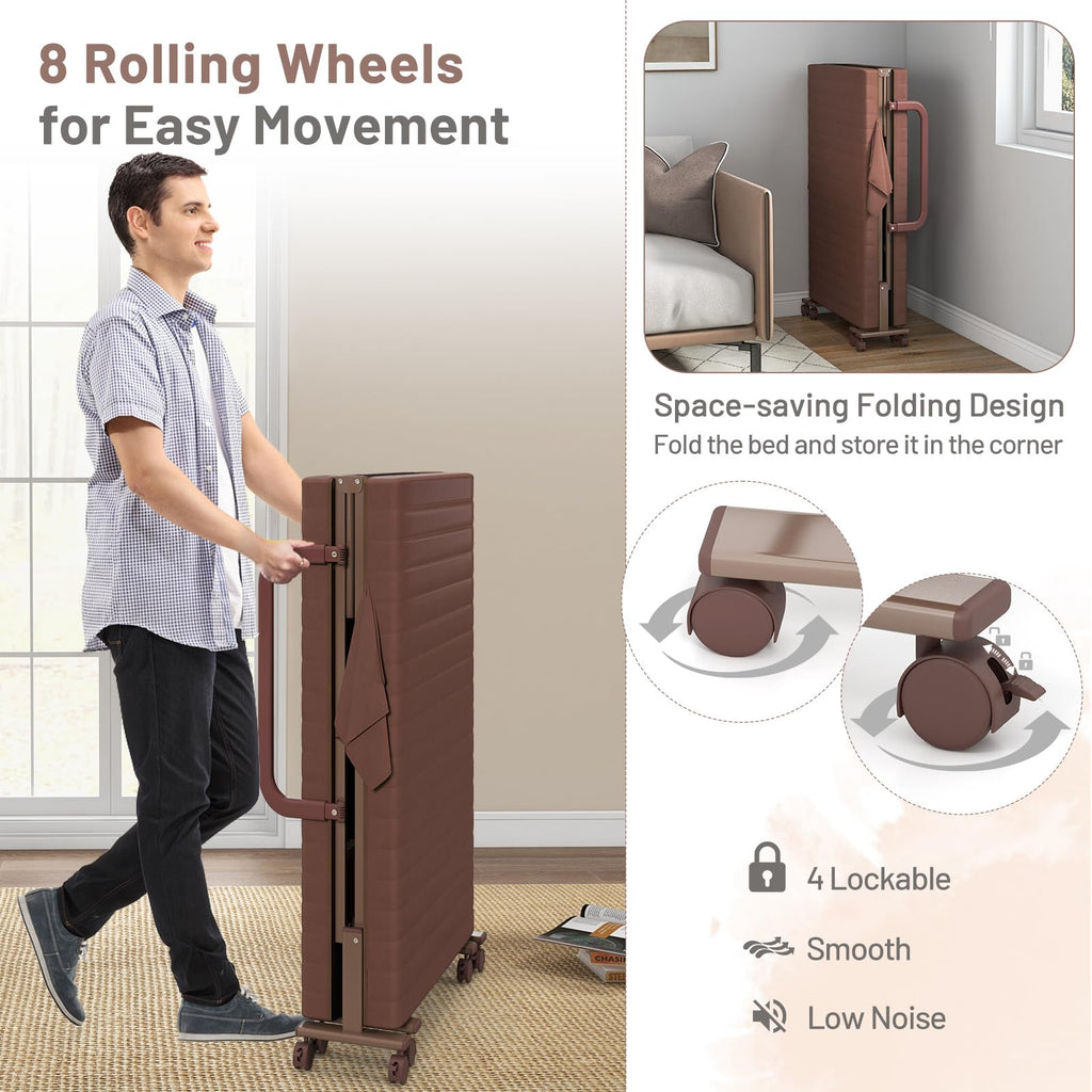 Flexible Wheels & Side Pockets: This folding bed is equipped with 8 wheels, four of which are lockable. With flexible wheels, you can easily move it anywhere. And with lockable wheels, it ensures safety when used. In addition, the side storage bag can put books and other items. The handrail, wrapped in a soft sponge, is not only for easy handling but also to ensure your safety while you are asleep.
