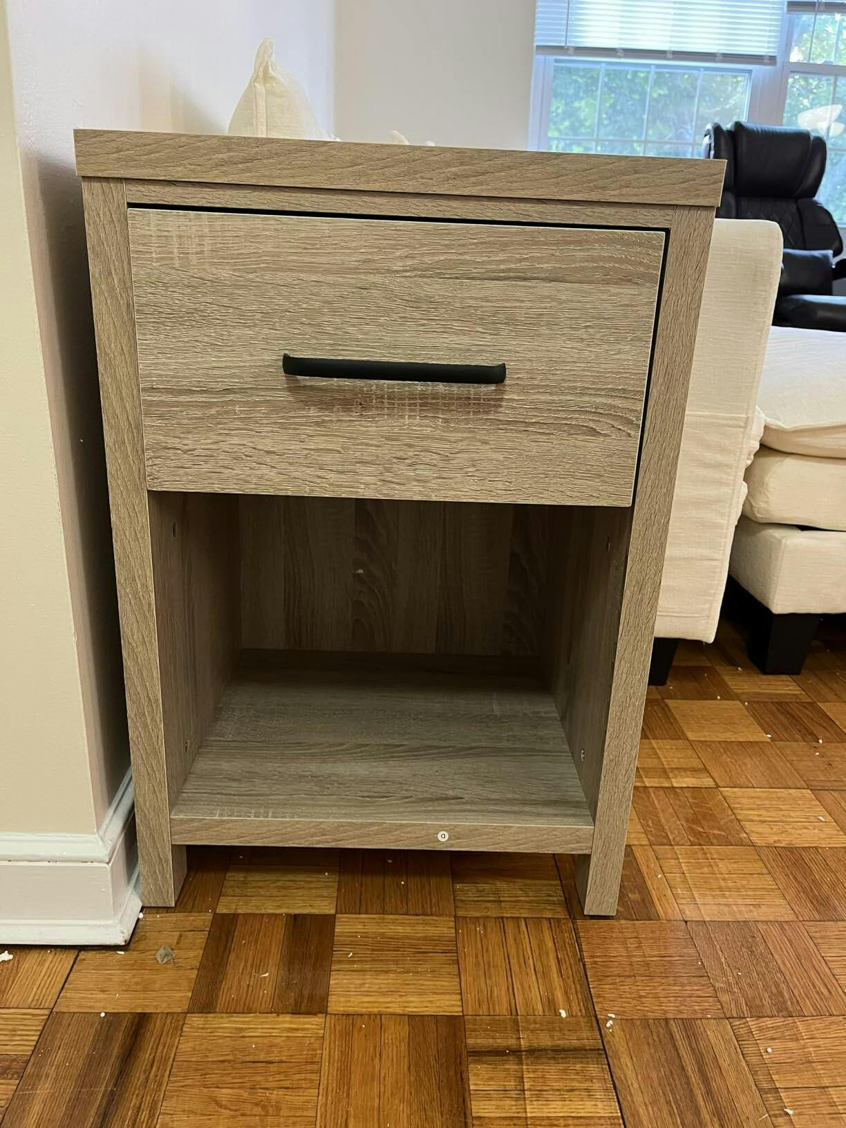 This 18"L x 15.5"W x 26.5"H nightstand excels in storage efficiency with a roomy tabletop, a spacious drawer, and a bottom shelf. You can neatly organize your glasses, magazines, alarm clocks, and beyond. Its sturdy construction ensures longevity, with reliable fasteners with screws. The rustic farmhouse design includes charming X-shaped side patterns, adding a touch of elegance to any room. This multipurpose piece can function as an end table or storage unit, making it a versatile addition to your living room and bedroom. The bedside table's thoughtful details include metal drawer slides, an easy-to-use metal handle, and protective foot pads to safeguard your floors.