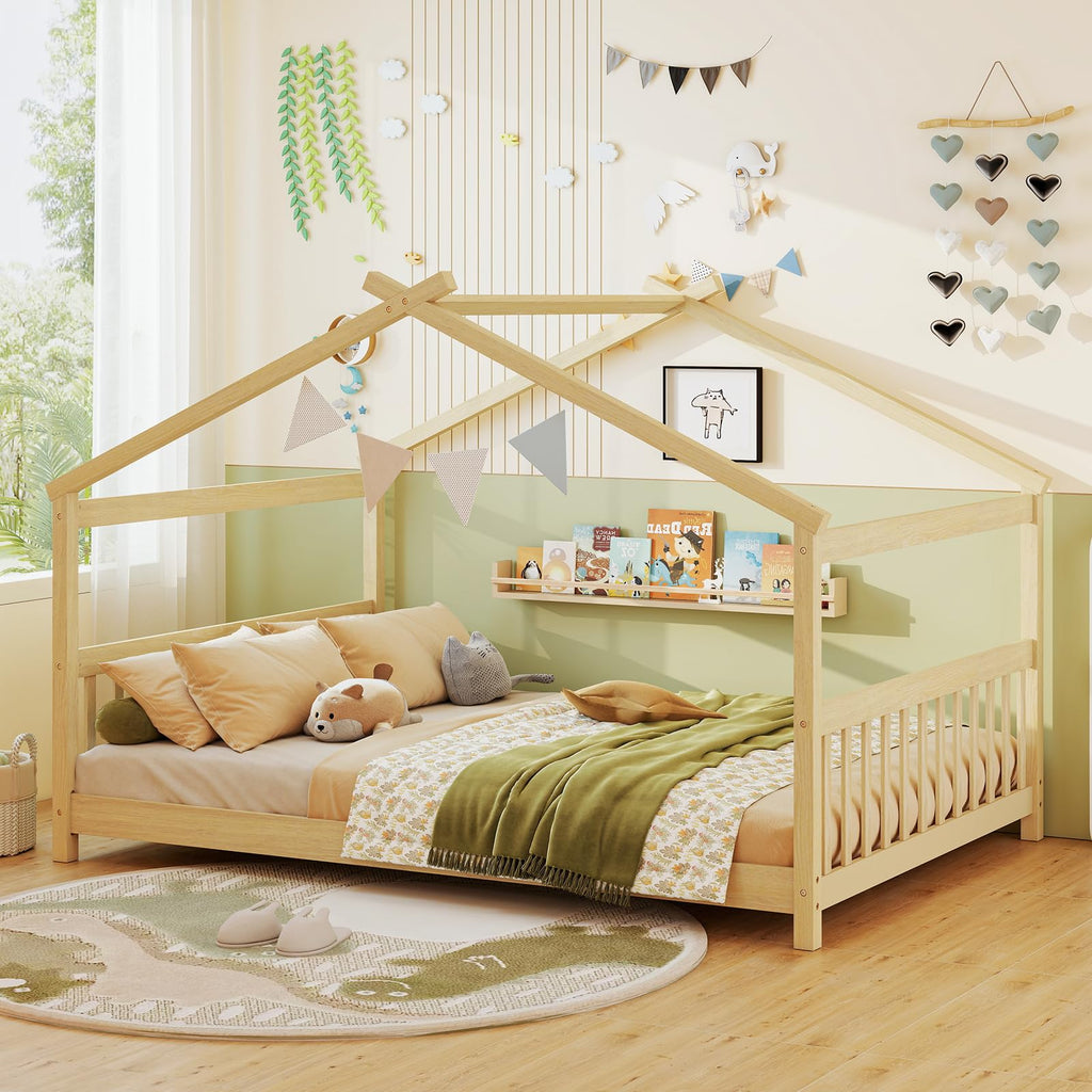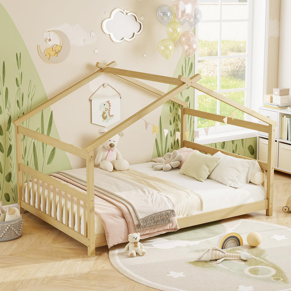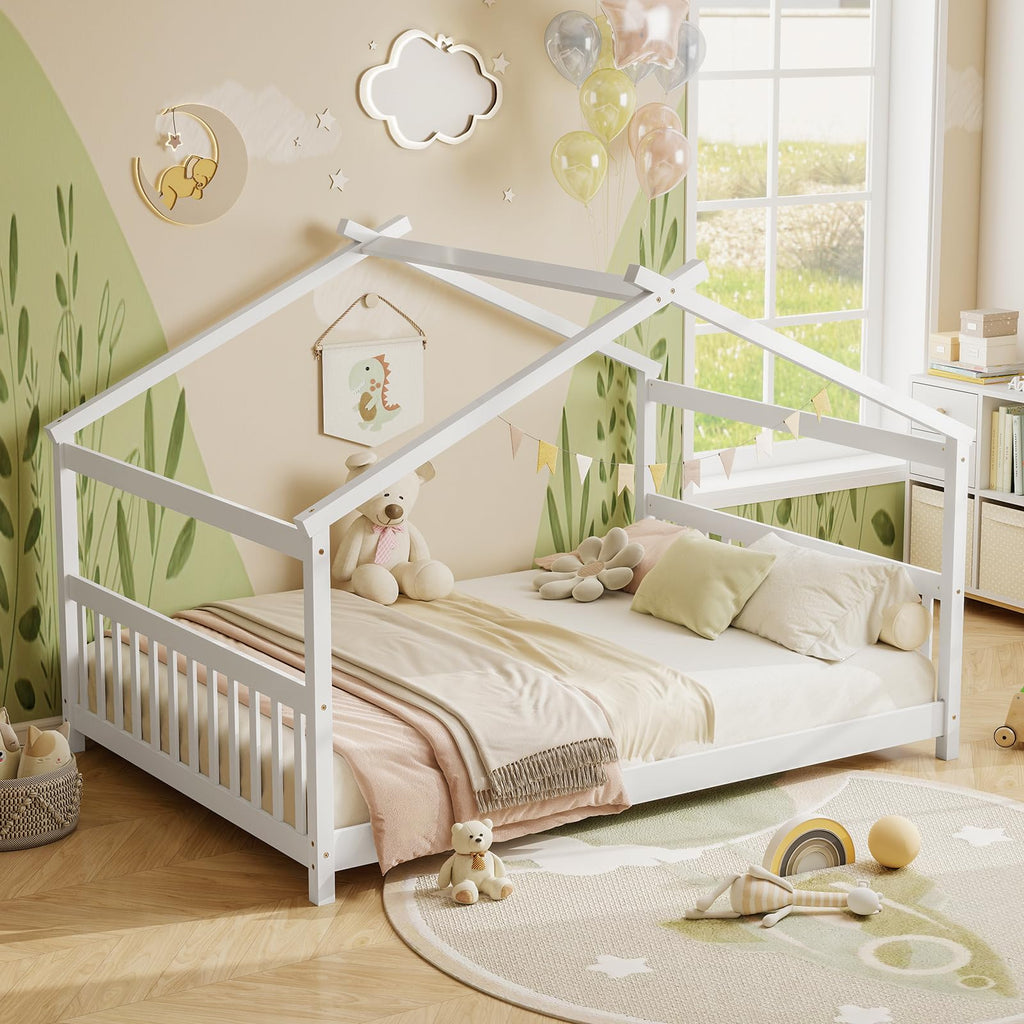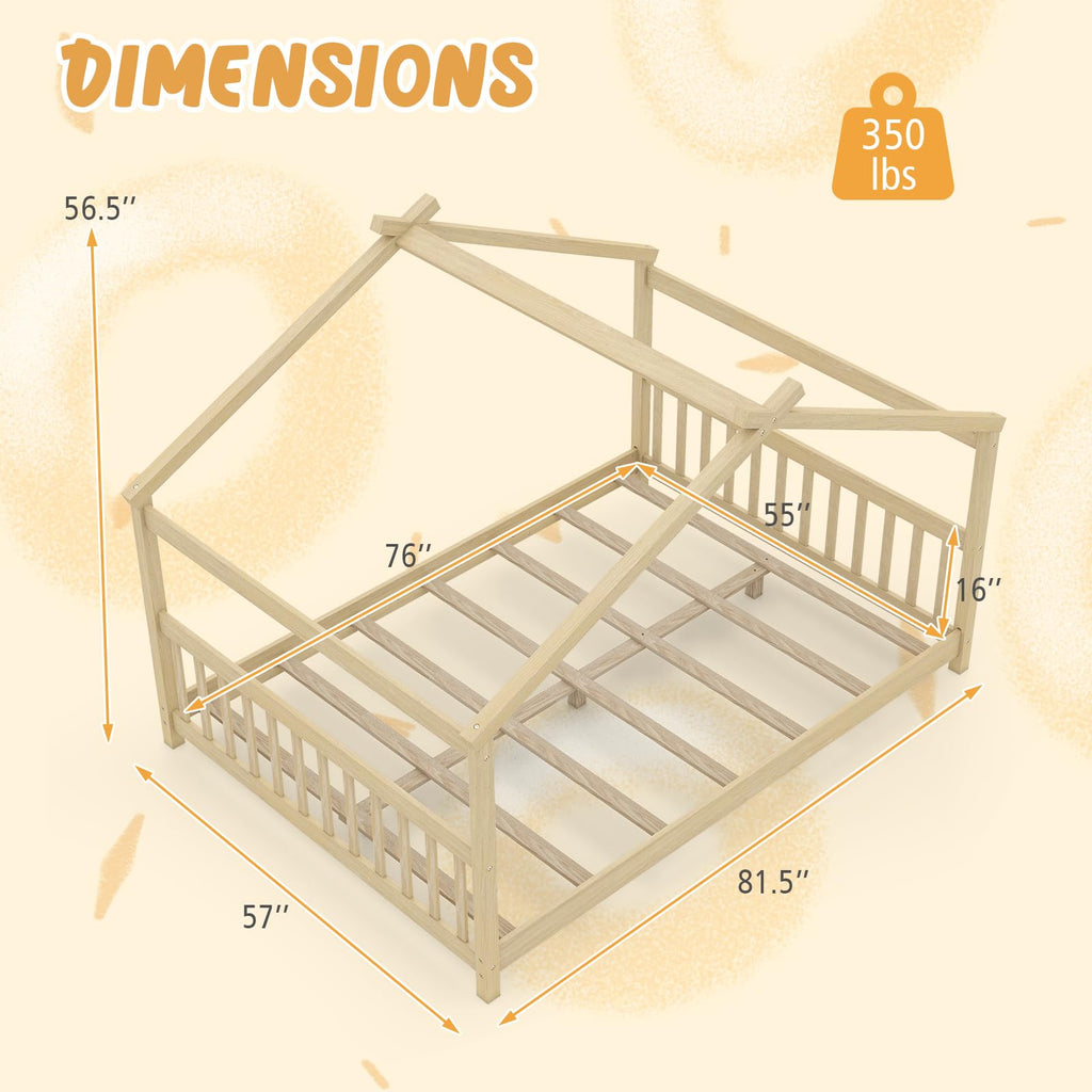 Transform bedtime into an adventure with its charming house design, and you can even personalize it with fairy lights or curtains for truly magical nights (ornaments are not included). Crafted from solid wood, this floor bed provides robust stability with added support legs for peaceful, wobble-free slumber. No box spring? No problem! Our full bed features a dependable built-in slat system. Additionally, the low-to-ground design ensures easy, safe access for your little ones, promoting independence while keeping safety a priority. Bring home this enchanting bed today, and let your child's imagination soar to new heights!