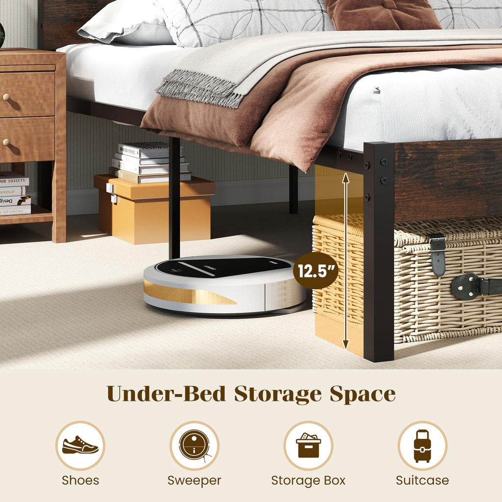 The bed platform is equipped with customizable RGB LED lighting to set the perfect mood with 4 dynamic and 16 static modes. This bed frame isn't just about aesthetics; it offers practical solutions like a built-in charging station with power outlets and USB ports right at your fingertips. Built to last, the frame features a heavy-duty metal construction with powder-coated slats and robust support legs, ensuring durability and stability. The embedded design prevent mattress sliding and are ideal for mattress thicknesses of 8"-12". Plus, enjoy extra storage space under the bed with 12.5" of clearance, perfect for storing essentials and easing cleaning. Upgrade your bedroom with this multifunctional and stylish bed frame, ensuring comfort and convenience in one elegant package.