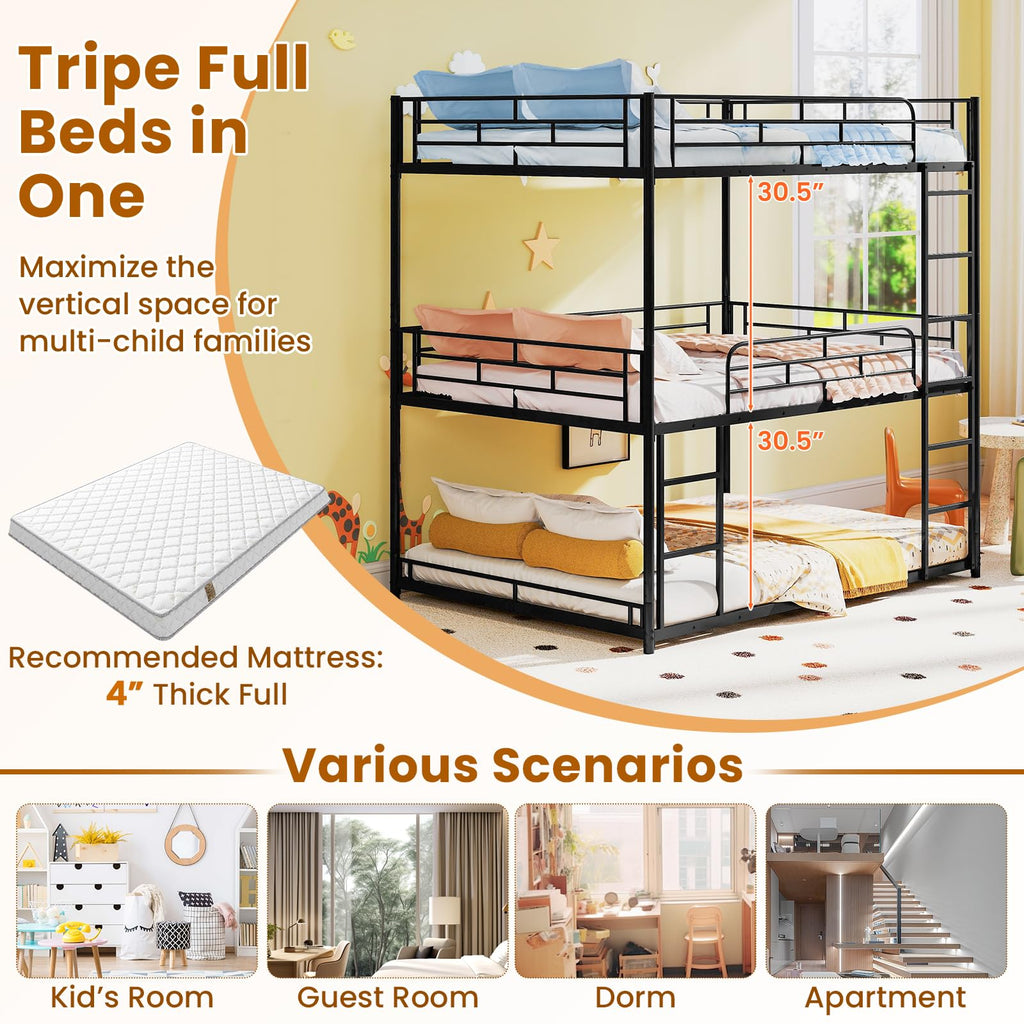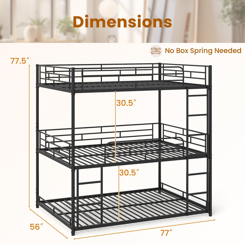 Transform your bedroom today! Discover the magic of space-saving design with our robust triple bunk bed, perfect for families big or small! Climb aboard effortlessly with its full over full over full size beds, making bedtime an adventure every night. Built to last with heavy-duty metal, withstand tough love from teens and adults alike with a whopping 660 lbs capacity on each tier. Keep climbing easy and safe with our sturdy dual ladders and high guardrails. Our bunk requires no box spring, just cozy mattresses for dream-filled nights. Don't wait! Securely anchor it to the wall for the utmost safety and dive into a worry-free sleep!