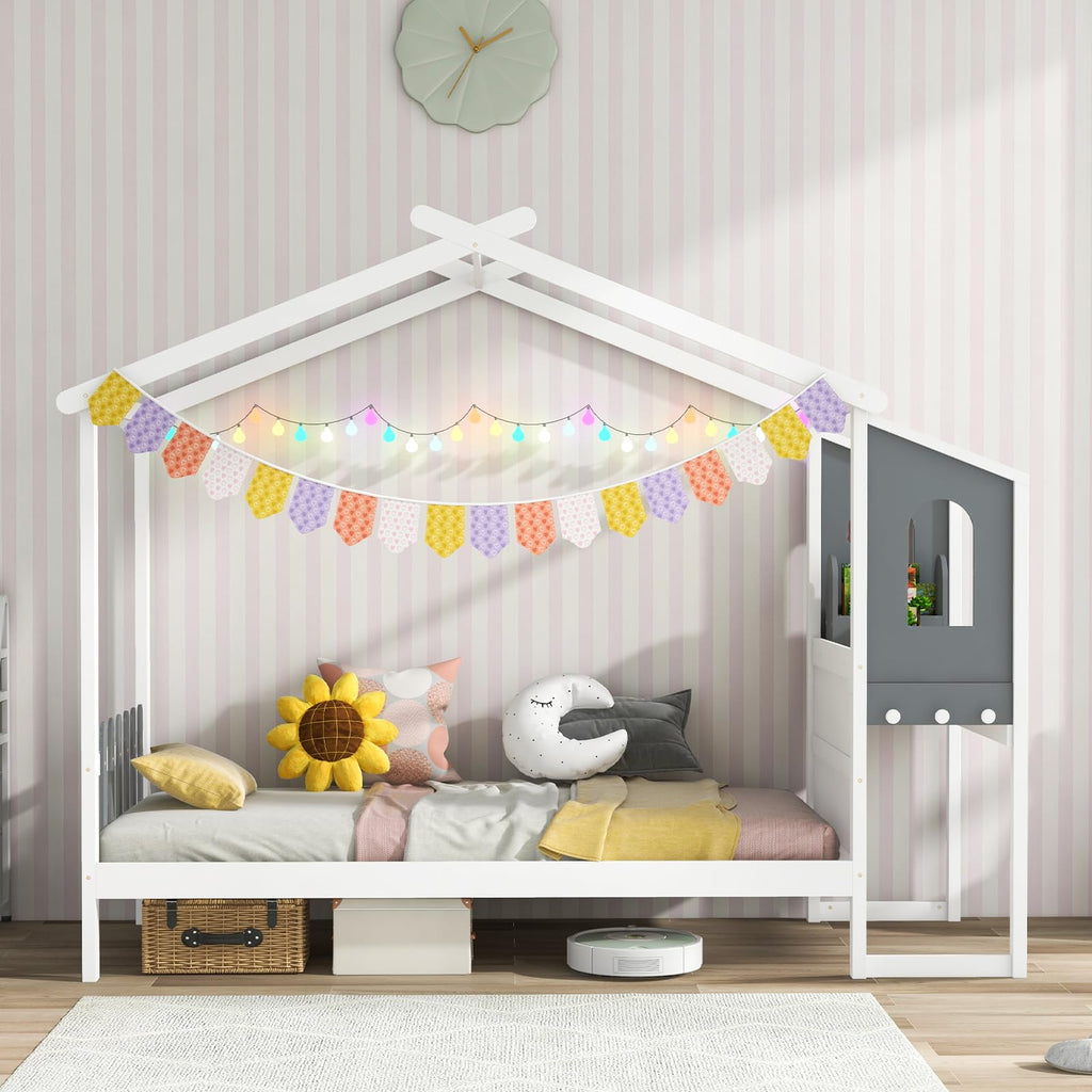 This Montessori-inspired bed frame is designed to get storage & studying into one and ignite your child's imagination. The house roof design allows for customization with decorative curtains to DIY kids’ themed bedroom. Crafted from solid wood frame and reliable wooden slats, this house bed frame is sturdy and durable to support long-lasting use. The desk is a perfect spot for your child to study, draw, or read. Designed with convenience in mind, you’ll find 2 drawers, storage box and 3 hooks, offering convenient storage for toys, books, stationery, clothes or sundries. More, sufficient under-bed space can meet daily storage needs and leave enough sweeping space. Let kid’s creativity soar in this modern playhouse bed!