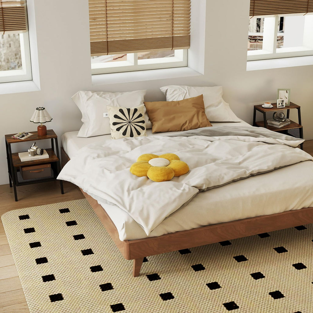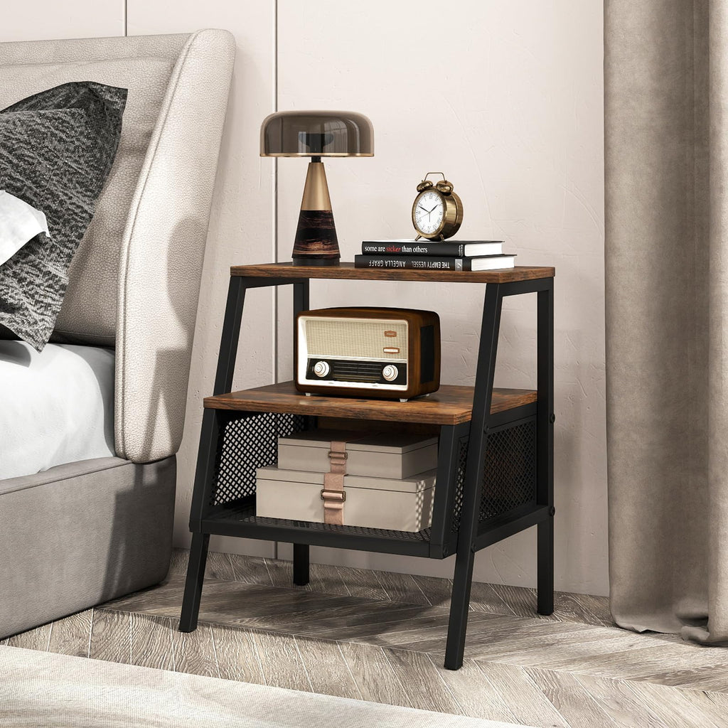 Discover the charm and functionality of our industrial chic nightstand! Perfect for small spaces, it stands at a convenient size, fitting snugly beside your bed or couch but leaving ample storage with its 3-tier shelving system. Stash away books, gadgets, and more in the stylish metal mesh compartment and easily accessible open shelves. Crafted with sturdy metal frames and soothing wood grain finishes, it boasts a robust construction with a dash of rustic elegance. Plus, it's a breeze to clean under, thanks to being raised 6.5" off the ground! Elevate your room's look with this must-have nightstand!