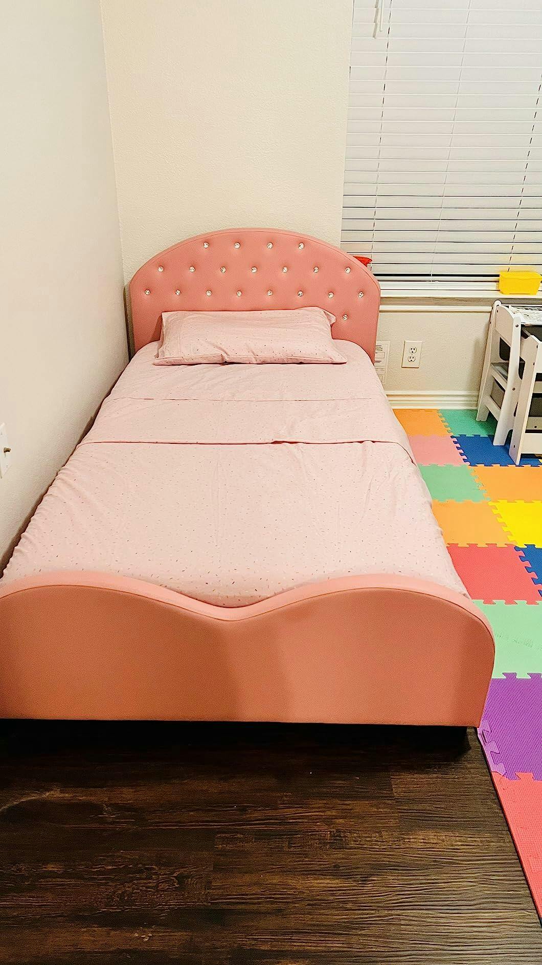 Soft Foam Padding Headboard & Foot board: This kid's bed for girls comes with a headboard and footboard, padded with the high-density sponge and covered with premium PVC fabric, which makes kids touch the surface more comfortably so that parents don't have to worry when your kid accidentally bumps the boards, which will protect your kid from getting hurt of such accident.