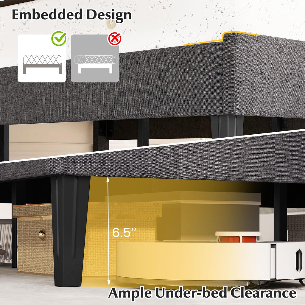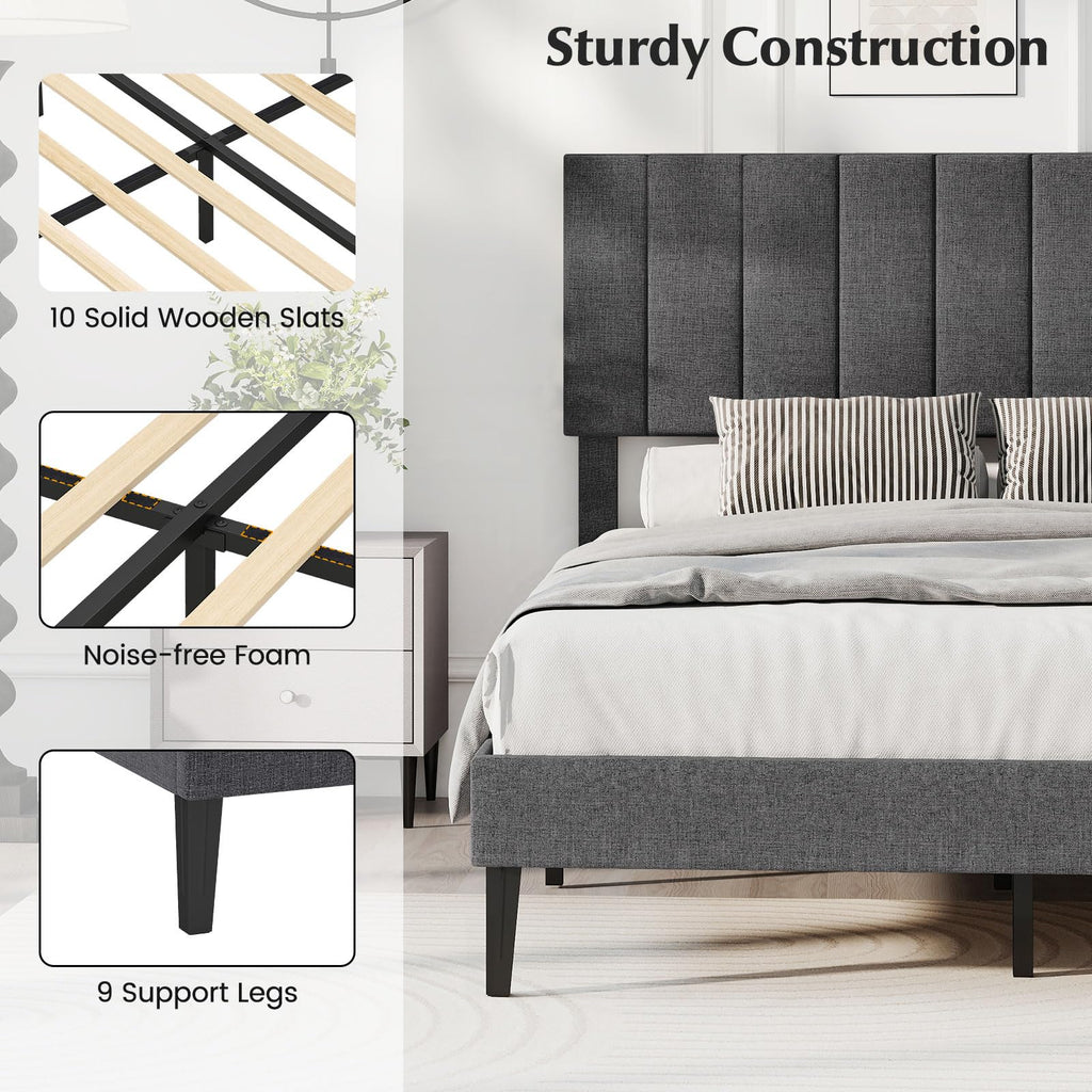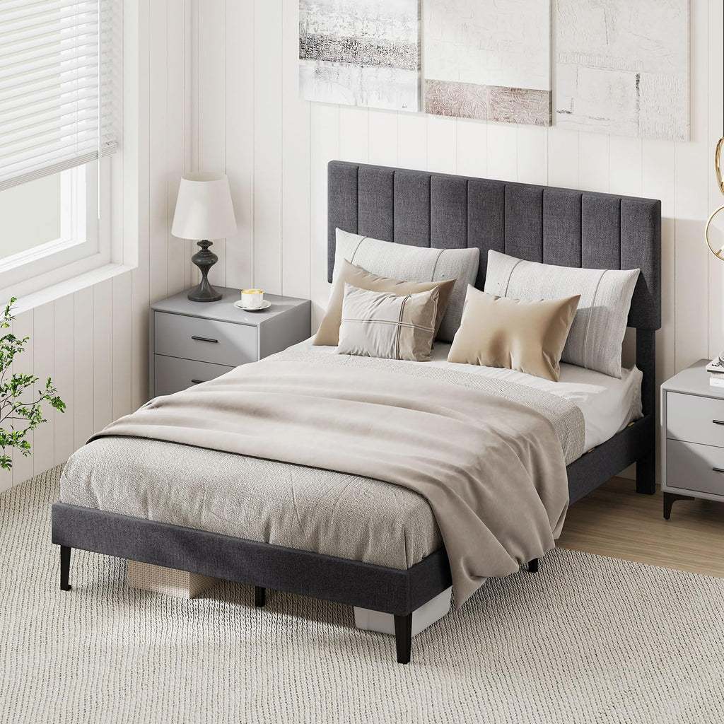 The bed frame features an adjustable headboard with 3 height options to tailor your sleep experience. Wrapped in Velvet Fabric/premium linen fabric and cushioned with high-density sponge, the headboard offers luxurious comfort. The frame's sturdy construction supports up to 500 lbs/800 lbs/800 lbs and includes 10 solid wooden slats and 9 support legs, ensuring durability and stability with no need for a box spring. Enjoy the quiet, noise-free design suitable for mattresses 10"-12" thick and benefit from 6.5 inches of under-bed clearance for convenient storage and easy cleaning. Upgrade your bedroom with this practical, stylish bed frame designed for the ultimate sleep experience.