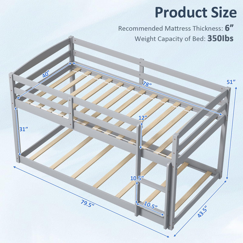 Specification Color: Grey/White/Pink/Natural Material: Pine Wood, Plywood Overall Dimension: 79.5" x 43.5" x 51" (L x W x H) Height of Guardrails: 12" Recommended Mattress Size: Twin(not included) Recommended Mattress Thickness: 6" Net Weight: 90.5 lbs Weight Capacity of Upper Bed: 350 lbs Weight Capacity of Ladder: 200 lbs Package Includes: 1 x Bunk Bed 1 x Instruction