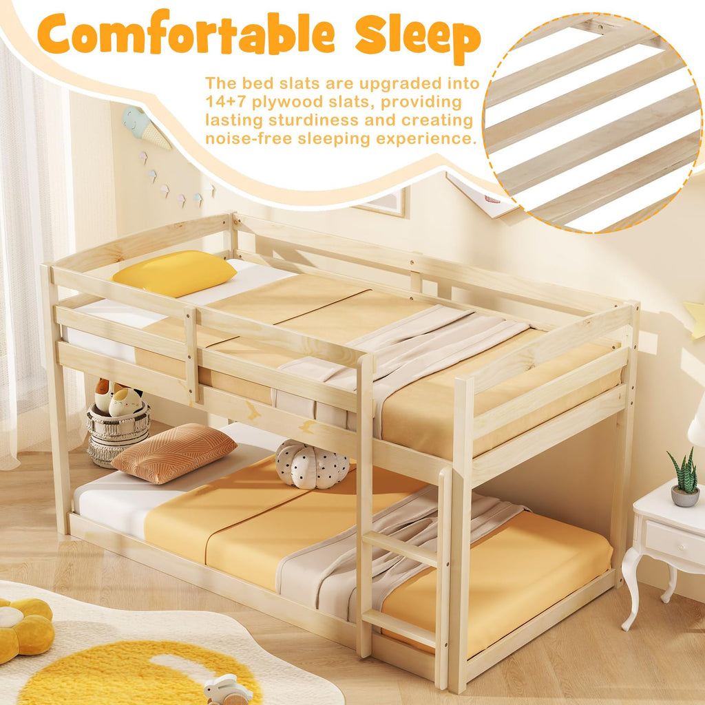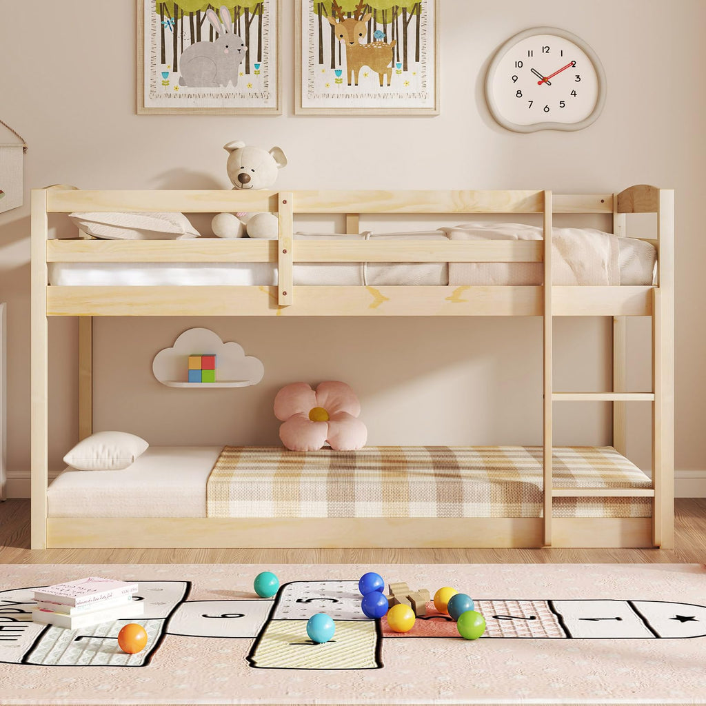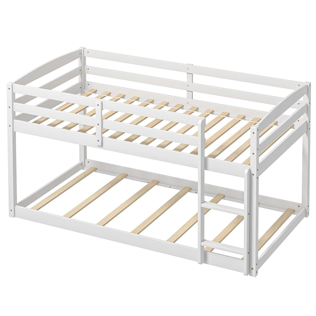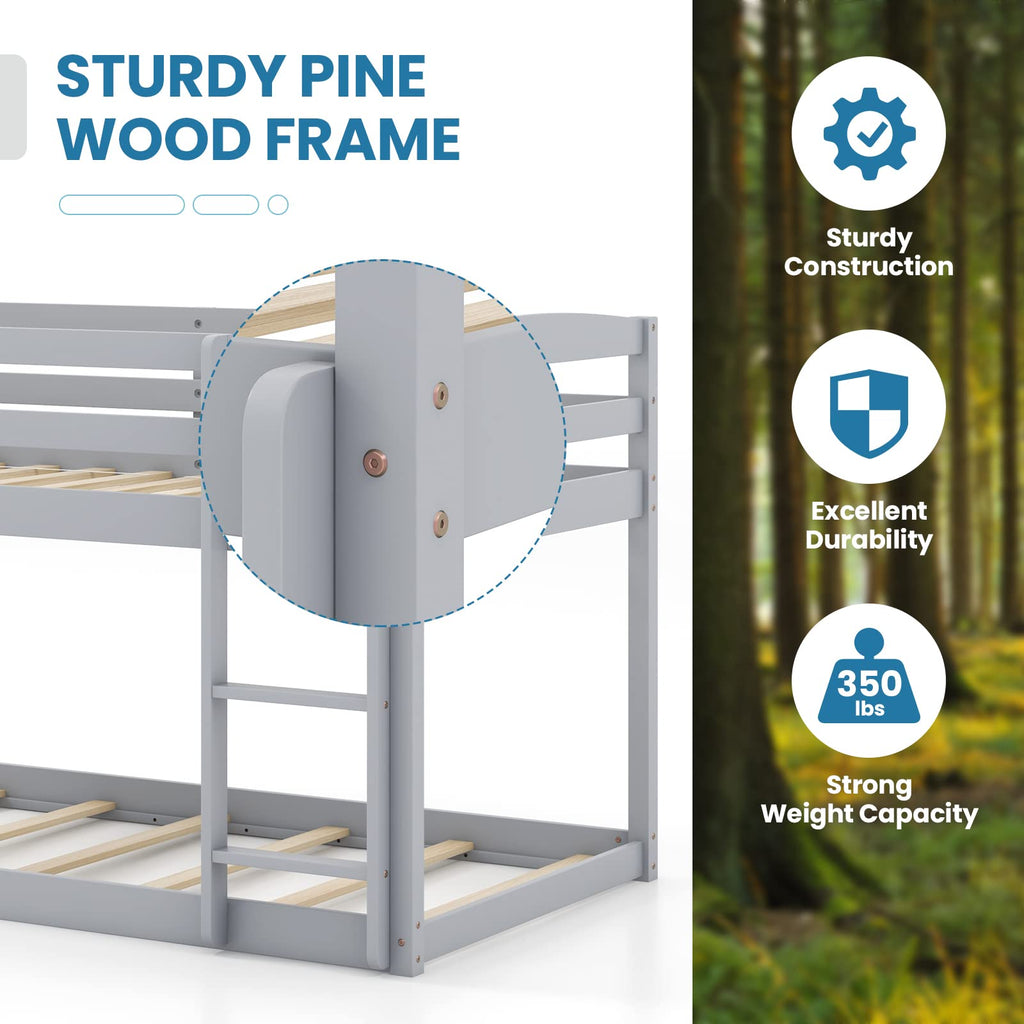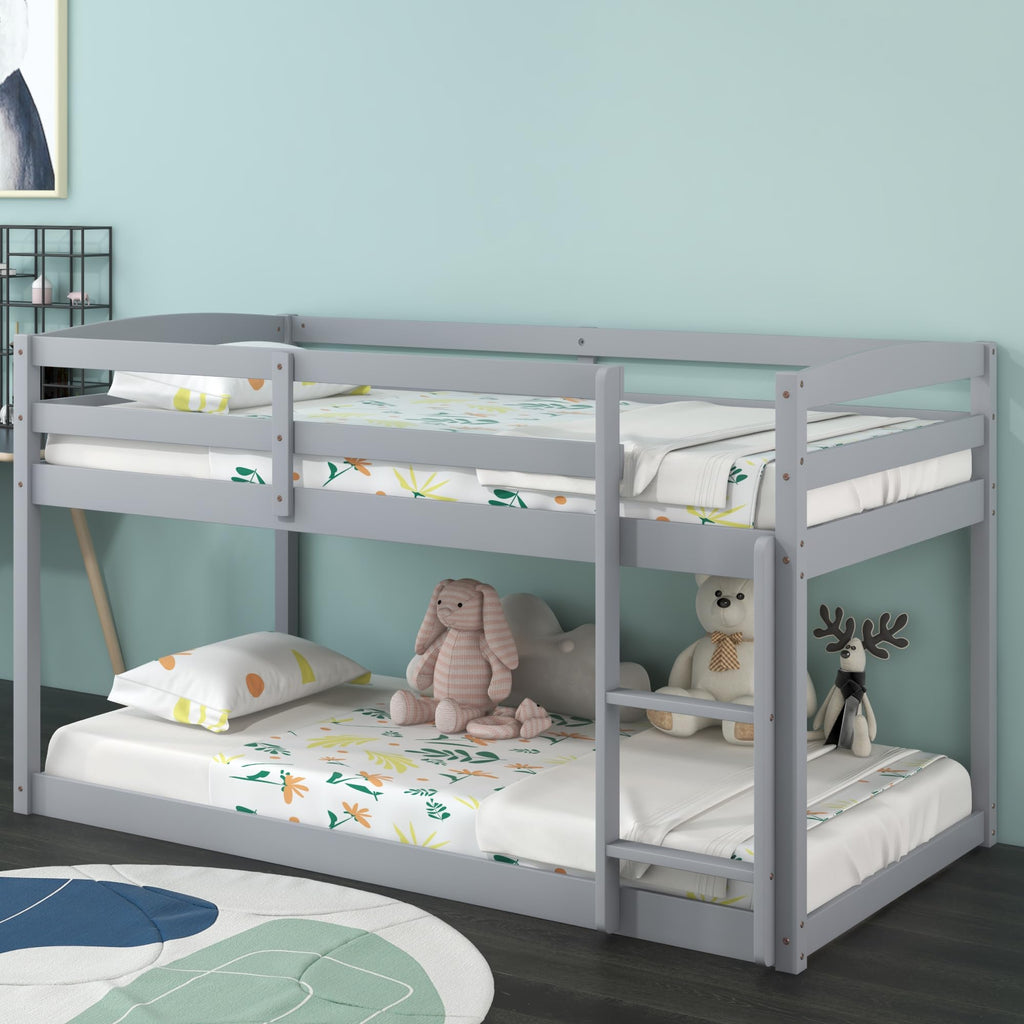 Feature Promises optimal stability and durability with sturdy pine wood frame Low floor bunk design enhances safety for your children Full-length guardrails on the top bunk provides safe sleeping experience 2-step ladder makes it easy for children to climb up and down Support slats are included, but no box spring is needed Modern appearance with classic silhouette can perfectly match your home With the included tools and illustrated instructions for easy installation Makes full use of floor space, ideal for both home and dorm