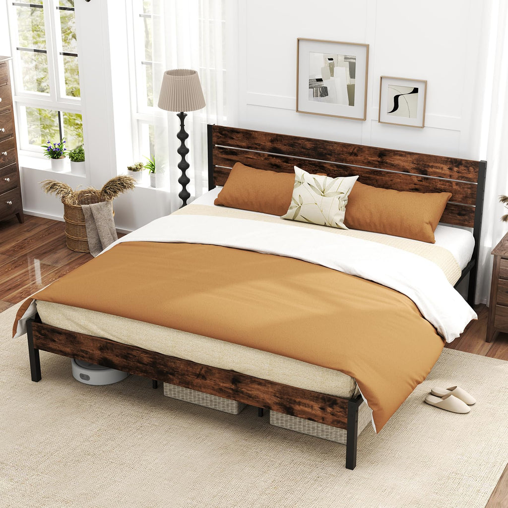 Boasting 12 heavy-duty metal slats and 2/5/8 additional support legs, the bed base can handle up to 660/1100 lbs with ease, providing reliable support for your mattress without the need for a box spring. The spacious under-bed area offers ample storage for linens, clothes, and luggage, while also accommodating a robotic vacuum. A tall, slatted headboard with a retro wood grain finish adds a distinctive industrial touch to your bedroom. Additionally, the snap lock design makes slat installation quick and painless. Enjoy a peaceful sleep with our bed frame!