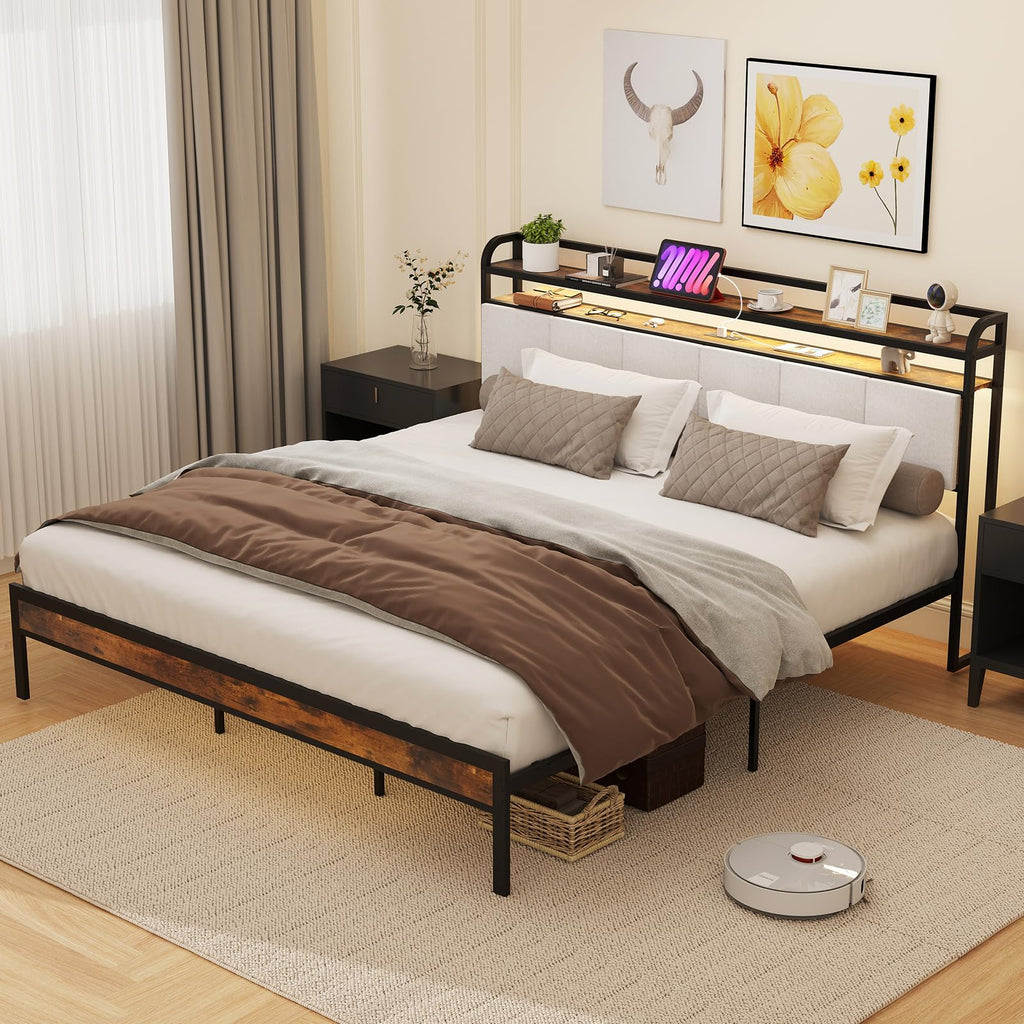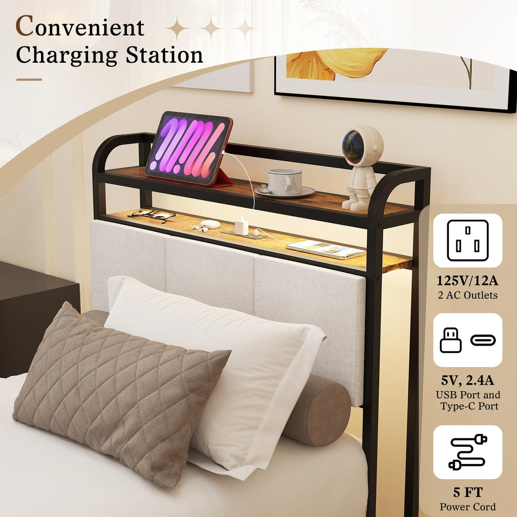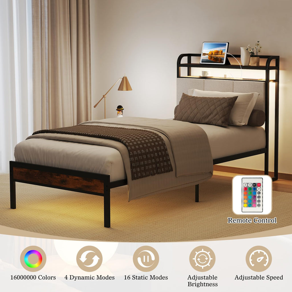 Transform your bedroom into a sanctuary of style and convenience with the metal bed frame. It enhances your sleep environment with customizable LED lighting, and the remote control allows you to easily select from over 16 million colors and adjust lighting modes to suit your mood, from vibrant and dynamic to soft and static. Moreover, the platform bed frame caters to your modern needs with built-in charging ports—2 AC outlets along with USB and Type-C ports. The 2-tier open shelf and sizeable under-bed clearance provide ample space for stowing away items and keeping your room tidy. Constructed with robust metal slats, the mattress foundation promises stability and durability. The generously padded headboard adds a touch of luxury, offering cozy support for night-time reading or relaxing before sleep.