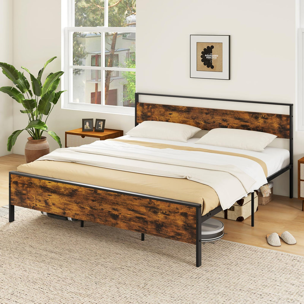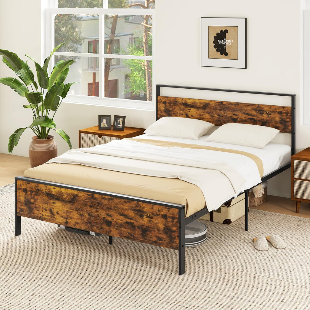 Upgrade your bedroom with this industrial bed frame featuring a wooden headboard and footboard. The combination of metal and rustic wood grain adds chic industrial charm that complements any decor. Designed for strength and longevity, the platform bed supports impressive weights of up to 485 lbs/800 lbs/800 lbs/1100 lbs, thanks to its sturdy metal slats and robust support legs. With 12.5 inches of under-bed clearance, you'll find ample space for boxes or seasonal clothing, keeping your room tidy. Plus, the metal slats mattress foundation eliminates the need for a box spring, accommodating 8"-12" mattresses for your convenience. With easy assembly, you'll have your new bed set up quickly, transforming your space into a cozy retreat.
