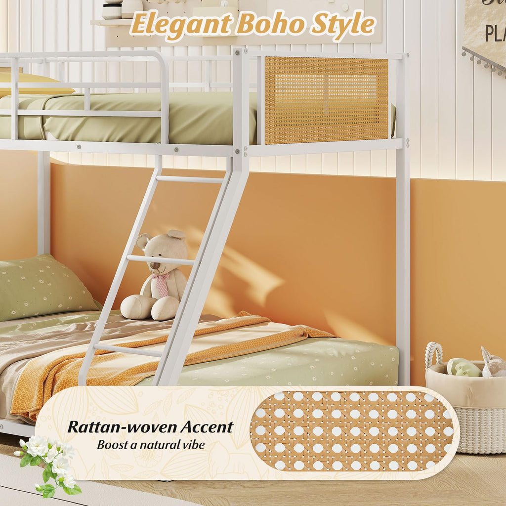 Transform your kids' bedroom into a stylish safe haven! Discover the perfect blend of form and function with our low-profile twin-over-full bunk bed! Ideal for rooms with low ceilings, this bed maximizes floor space while offering a comfortable sleep setup. Experience solid, squeak-free nights thanks to the heavy-duty metal frame that supports up to 600 lbs across two levels. Safety comes first with a full-length guardrail and rounded corner to protect your restless little ones. Plus, the charming boho rattan accents on each headboard add a touch of warmth, making this bunk bed a true statement piece that both kids and parents will adore. Forget about box springs and tedious setup—our supportive platform lets you set up your mattresses in no time and reclaim your space! Bring home the bedroom upgrade you've been dreaming of!