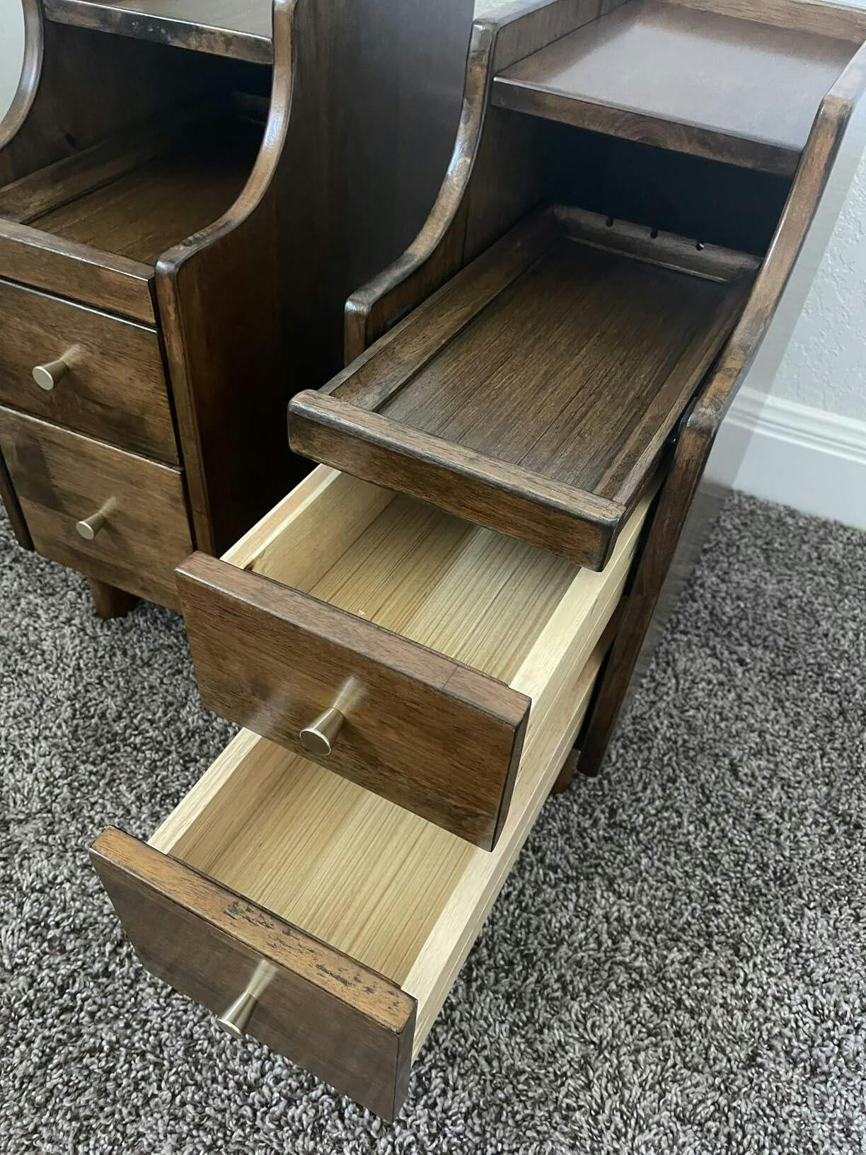 Transform your chaotic bedside into a neat haven with this sleek yet space-saving nightstand! Crafted from high-quality rubber wood, this slim side table not only provides long-time companion but also enchants with its elegant, retro charm. Featuring a pull-out tray complete with cable slots, 2 roomy drawers to stash all your nightly needs, and discrete cable management, it ensures your space stays orderly and stylish. No more morning mess! Plus, its safety-smart design with raised edges and rounded corners ensures you enjoy peace without spills. Ideal for tight spots, it fits perfectly by your bed or sofa, enhancing even the smallest spaces!