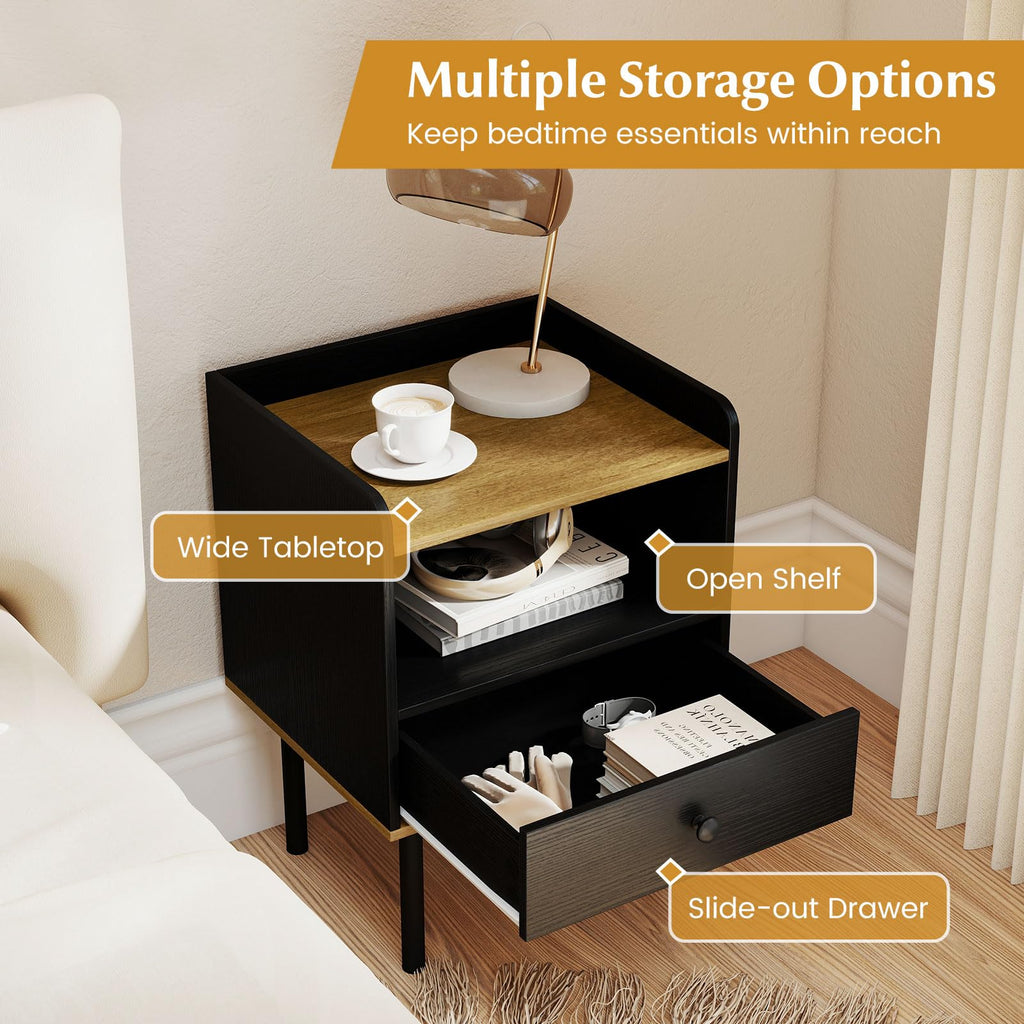 Elevate the functionality and style of your living area with this 3-tier nightstand! The drawer provides convenient storage for essential items, while the wide top and open shelf offer space for books or decorative accents. Set on raised metal legs with protective pads, the side table improves higher stability while making floor cleaning a breeze. Whether placed next to your bed or used as a side table in the living room, this versatile nightstand combines practicality with chic design.