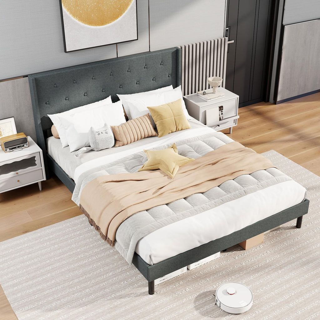 This queen size bed frame features an upholstered headboard covered by skin-friendly and breathable linen fabric and padded by high-density sponge, adding a comfy and inviting touch to your relaxation. Meanwhile, its classic tufted wingback design makes it a perfect choice to enhance aesthetics. This platform bed is also built for sturdiness, holding up to 800 lbs for your peace of mind. Its strong support system including robust slats, solid rubber wood legs and adjustable middle feet provides reassuring firmness for a stable foundation. Plus, convenience is ensured with its underside space, allowing for both easy storage and cleaning. The embedded design ensures a secure fit for your mattress (not included).