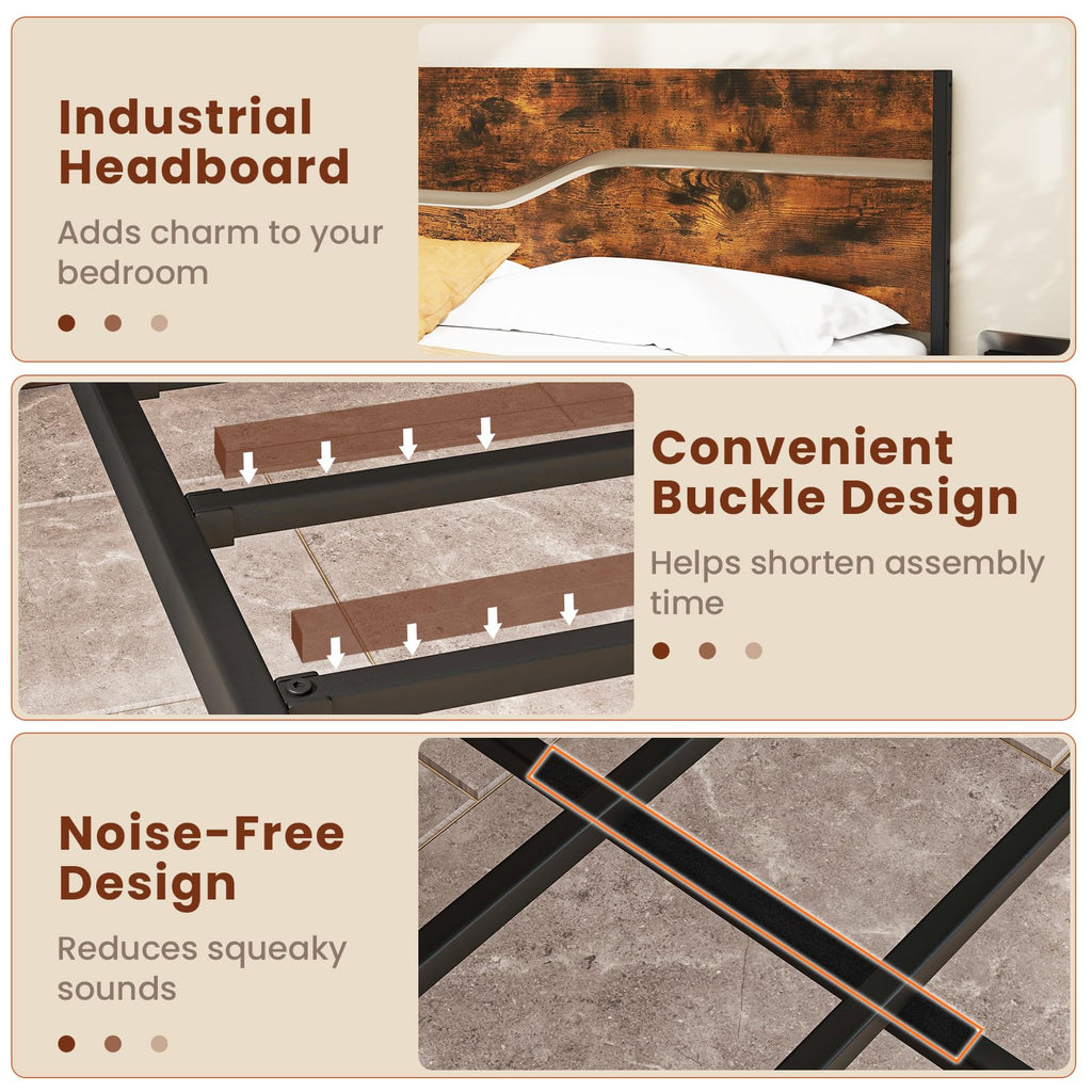 Upgrade your bedroom with this industrial platform bed frame featuring a rustic wooden headboard and footboard. Built from powder-coated metal, the heavy-duty bed frame offers exceptional durability and sturdiness. The slatted design ensures optimal mattress support, eliminating the need for a box spring. With under-bed clearance, the platform bed frame provides space for extra storage, helping keep your room neat and organized. The easy buckle design makes assembly a breeze, with all tools and instructions included. This industrial metal bed frame blends function with vintage charm, creating the perfect balance of comfort and style.