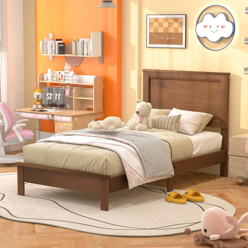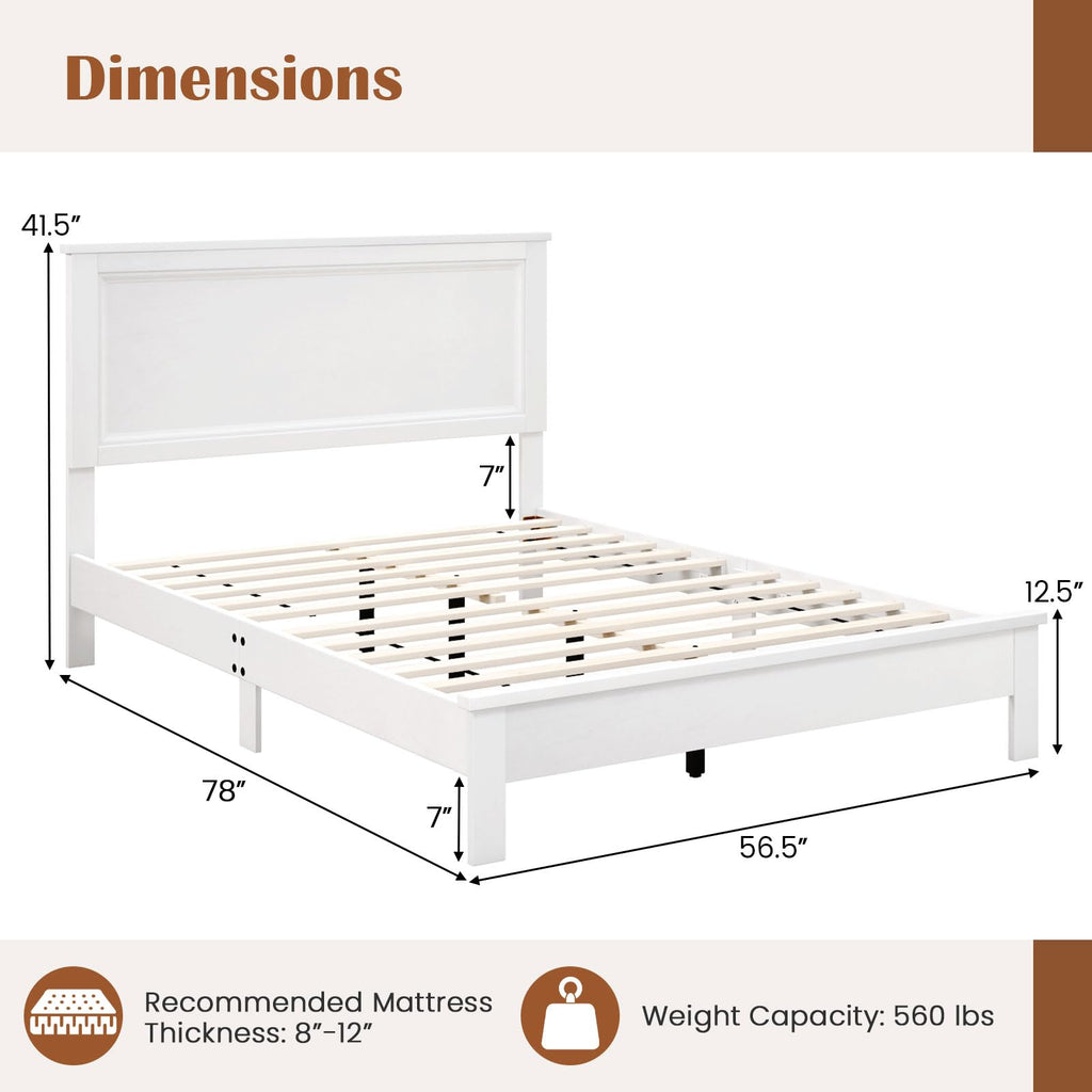 Specification: Color: Walnut Material: Rubber Wood + Engineered Wood + MDF Twin Overall Dimensions: 78" x 41.5" x 41.5" (L x W x H) Footboard Height: 12.5" Recommended Mattress: 8"-12" Twin Net Weight: 51 lbs Weight Capacity: 500 lbs Full Overall Dimension: 78" x 56.5" x 41.5" (L x W x H) Footboard Height: 12.5" Recommended Mattress: 8"-12" Full Net Weight: 64 lbs Weight Capacity: 560 lbs Queen Overall Dimension: 82.5" x 63" x 42" (L x W x H) Footboard Height: 12.5" Recommended Mattress: 8"-12" Queen Net Weight: 67 lbs Weight Capacity: 800 lbs