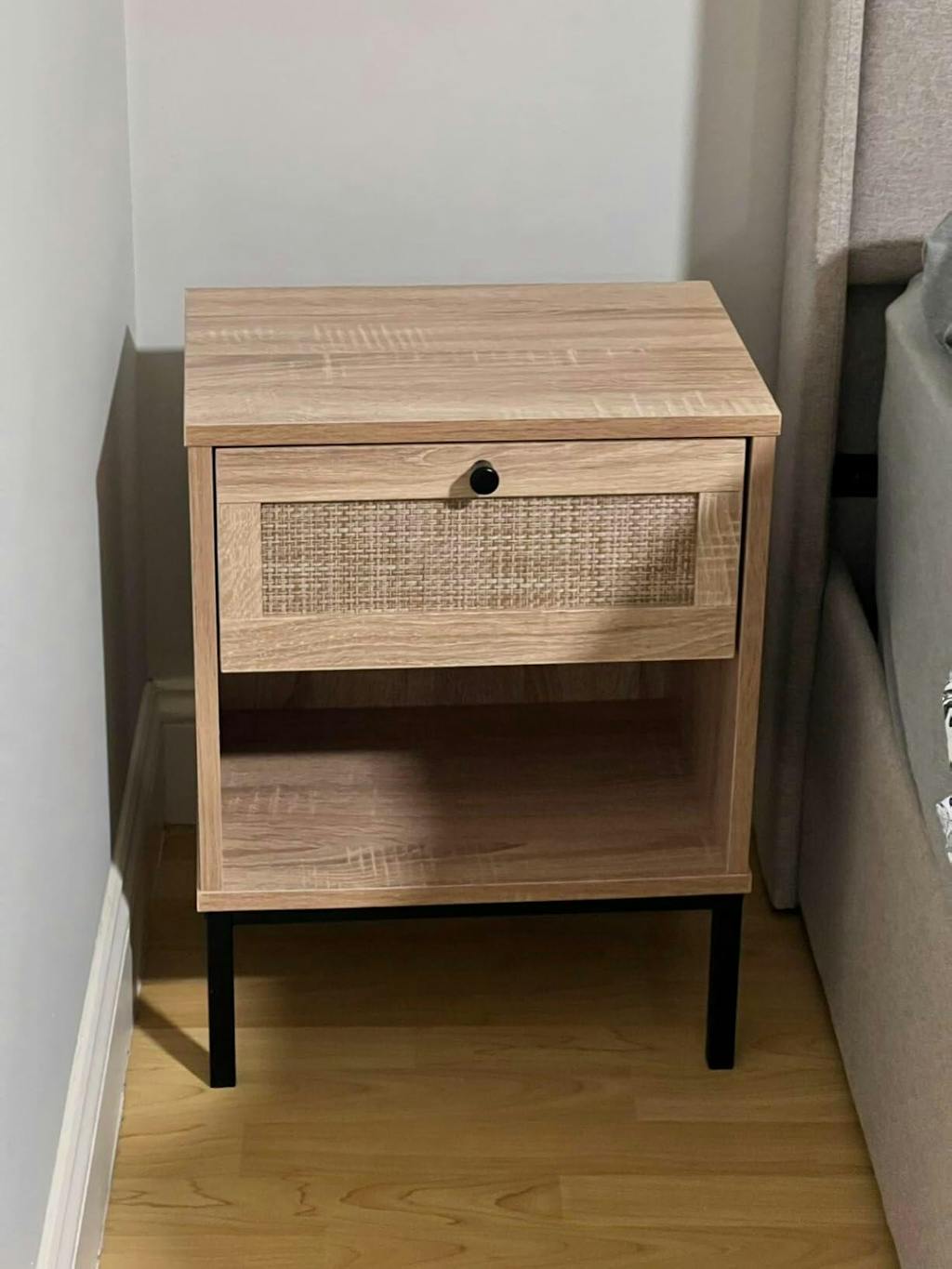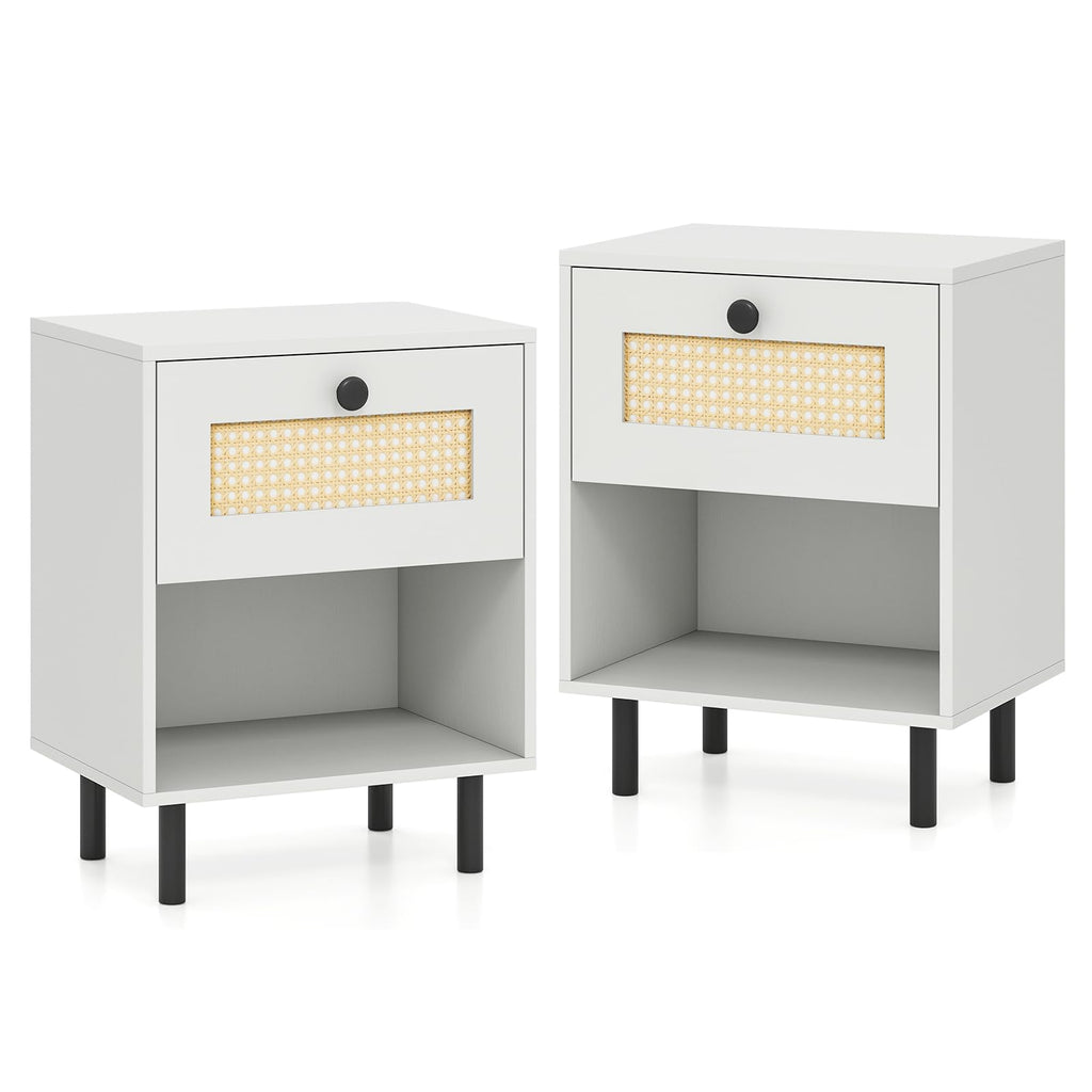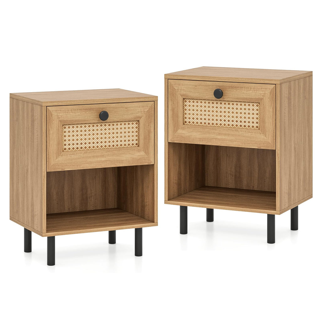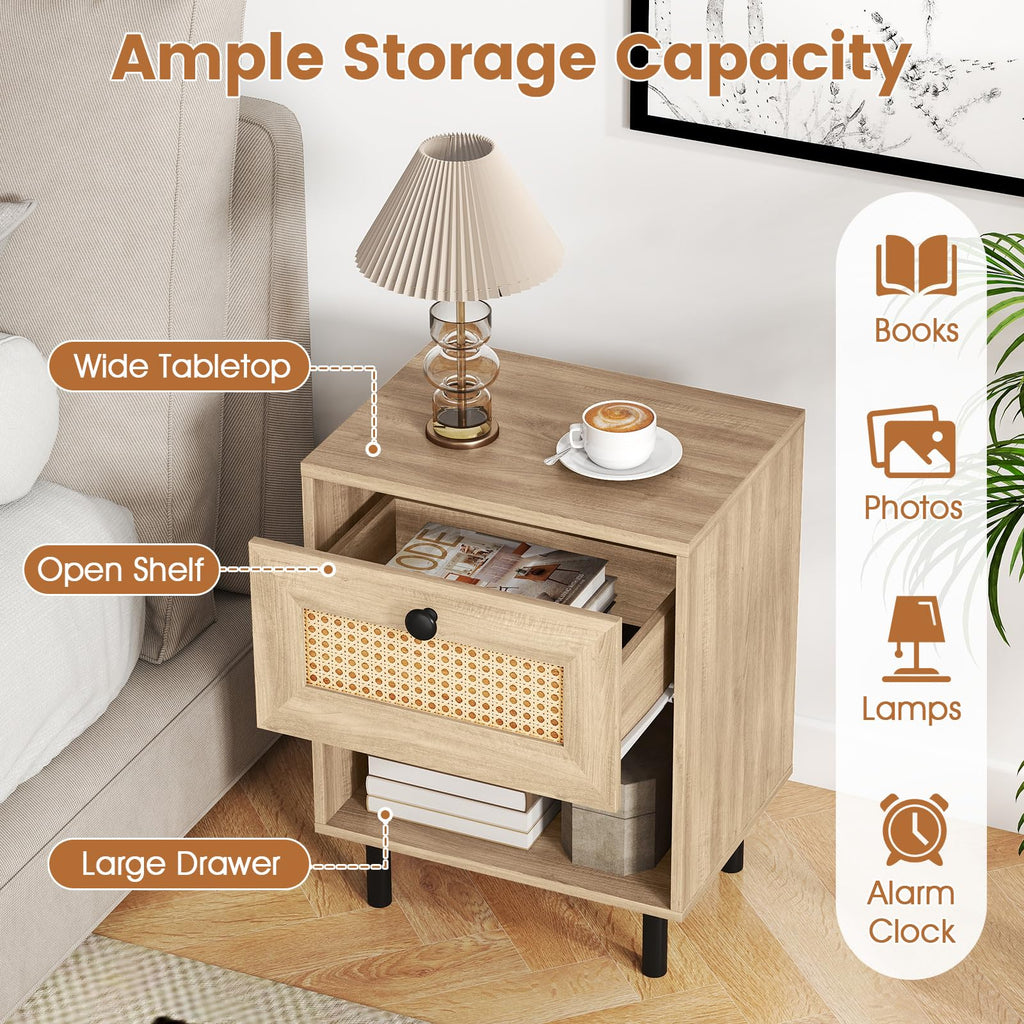 Crafted with a hand-woven rattan exterior, the boho style nightstand adds warmth and character to your room. Featuring a wide top, a convenient drawer and an open storage shelf, this bedside table provides organized space to keep essentials close at hand. The sturdy metal legs offer stable support while dual anti-toppling kits enhance safety by securing the table to walls. This accent end table blends natural textures with functional design, offering a charming accent piece for bedrooms, living rooms, or compact spaces.