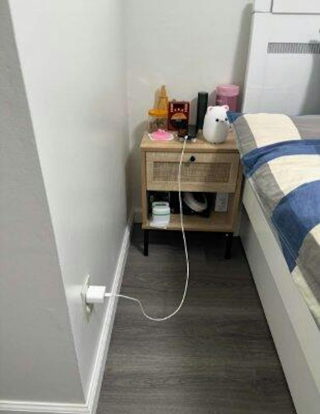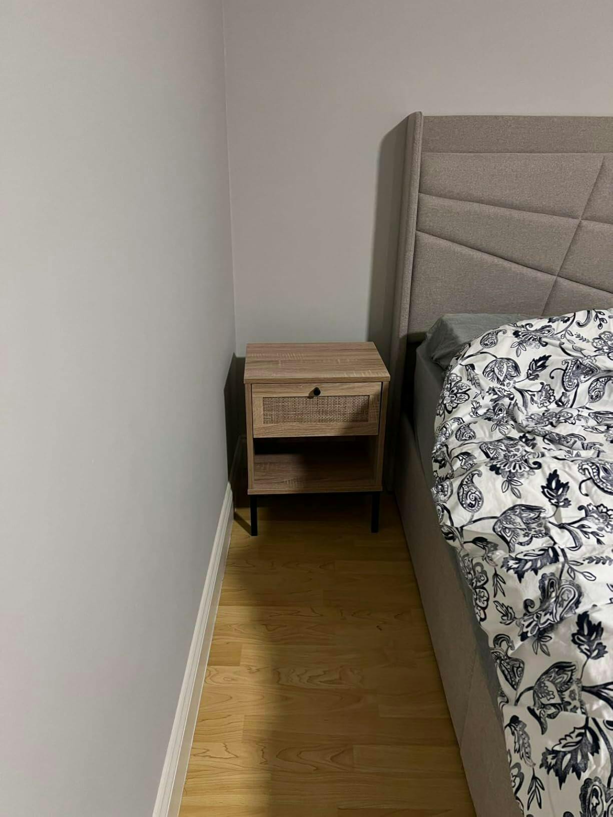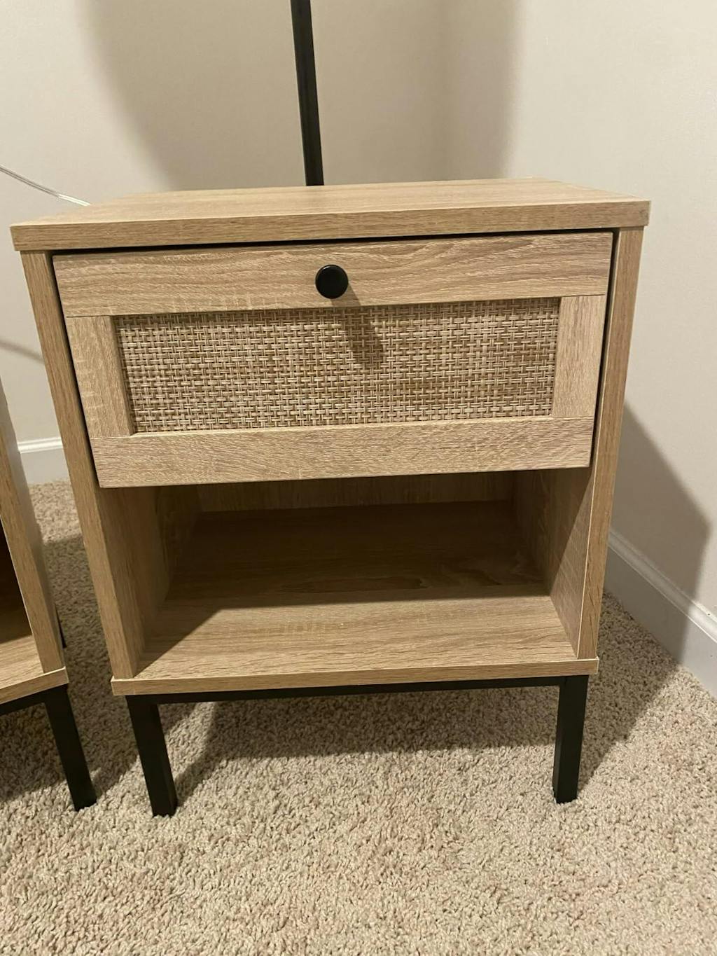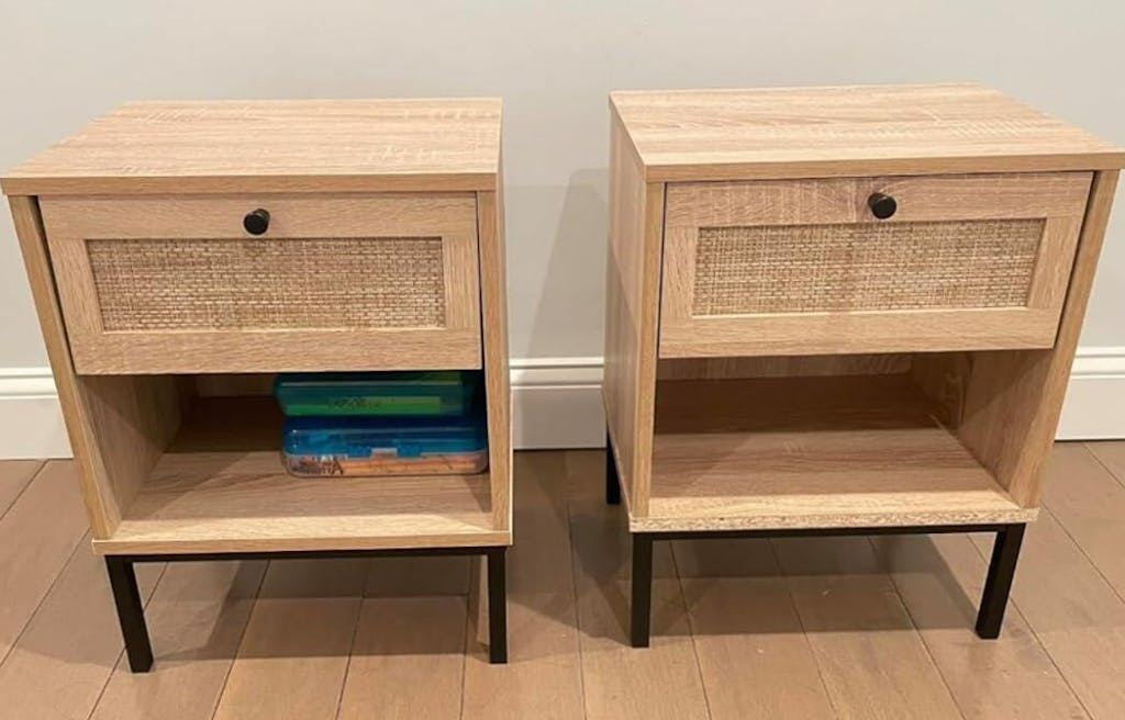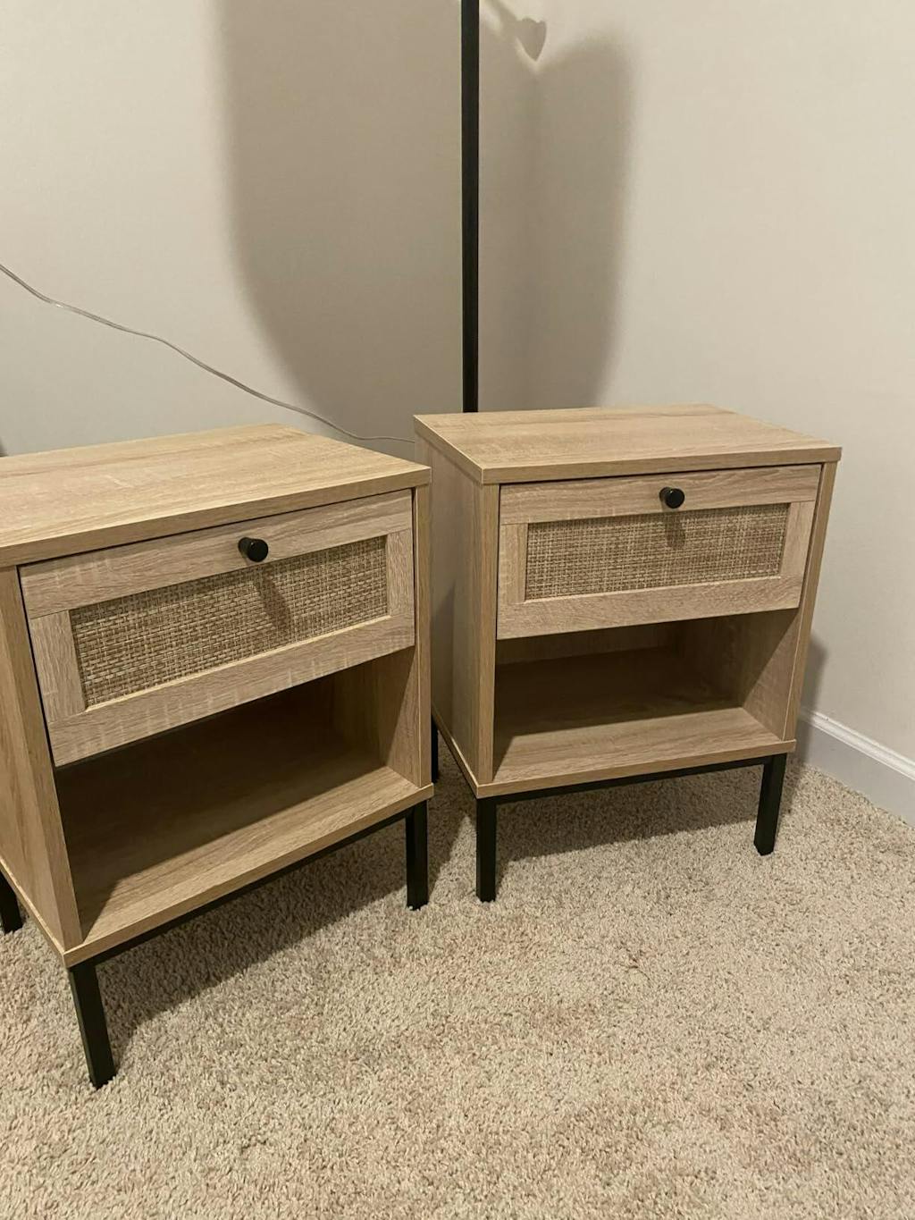 Crafted with a hand-woven rattan exterior, the boho style nightstand adds warmth and character to your room. Featuring a wide top, a convenient drawer and an open storage shelf, this bedside table provides organized space to keep essentials close at hand. The sturdy metal legs offer stable support while dual anti-toppling kits enhance safety by securing the table to walls. This accent end table blends natural textures with functional design, offering a charming accent piece for bedrooms, living rooms, or compact spaces.