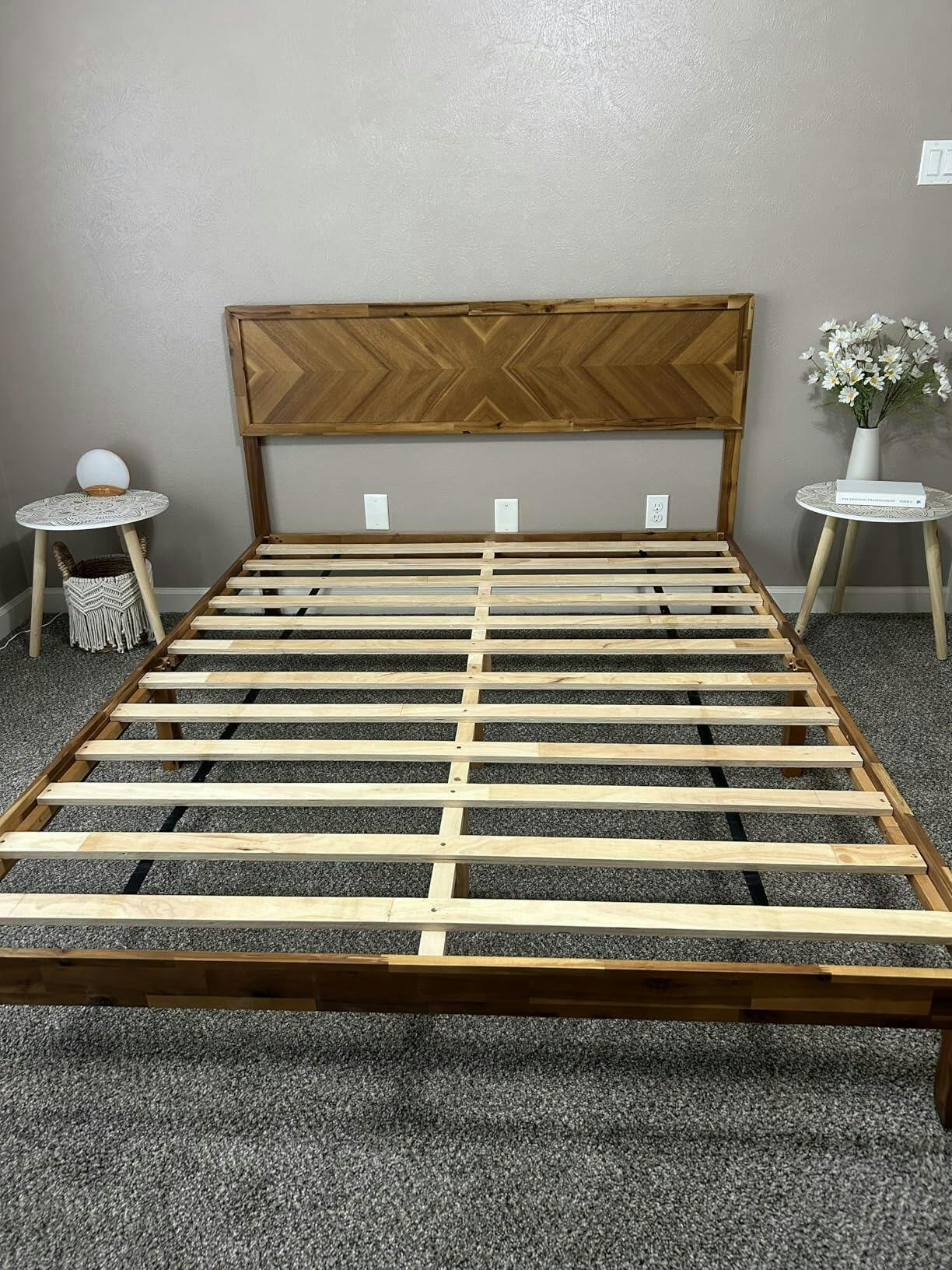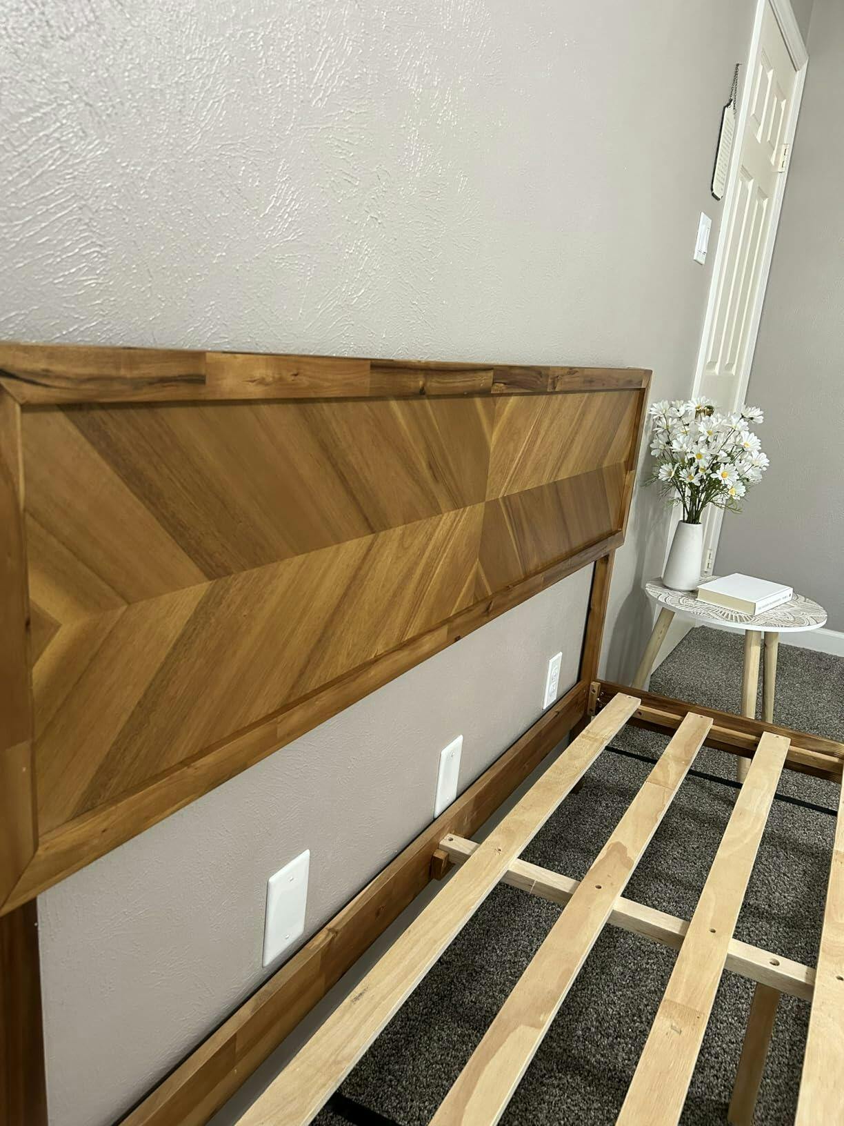 Elevate the aesthetic of your bedroom with this exquisite rustic-style headboard and footboard, designed to seamlessly complement various decor themes. Crafted from premium acacia wood and rubber wood, this bed frame guarantees long-lasting durability and reliability, supporting weights of up to 550 lbs/660 lbs effortlessly. Experience a peaceful night's sleep without the need for a box spring, thanks to the 12 supportive plywood slats that offer a sturdy mattress foundation. Keep your living space organized and clutter-free with the generous 9" under-bed storage space, perfect for storing luggage, shoes, or other essentials. The thoughtful details, such as adjustable foot pads for balance on uneven surfaces and floor protection, ensure both functionality and aesthetics. Revel in the warmth and charm brought by the unique woven texture of the headboard, enhancing the overall ambiance of your room. Experience the perfect blend of style, functionality, and comfort with this rustic-style bed frame.