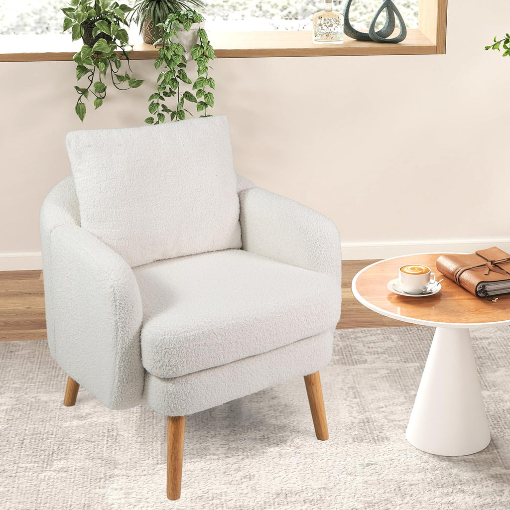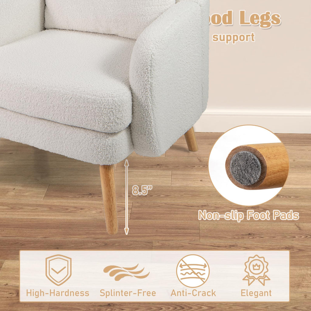 Upholstered in skin-friendly sherpa material and equipped with soft fillings and elastic spring support, this accent chair ensures lasting comfort and shape retention. With a curved backrest, spacious seat, and thickened armrests, the padded chair offers optimal support and relaxation. Supported by robust rubber wood legs capable of holding up to 330 lbs and non-slip footpads to protect your floors, this chic and modern chair is an ideal addition to living rooms, bedrooms, or offices, bringing both functionality and a touch of elegance. Elevate your indoor spaces with this reading chair featuring well-crafted details.
