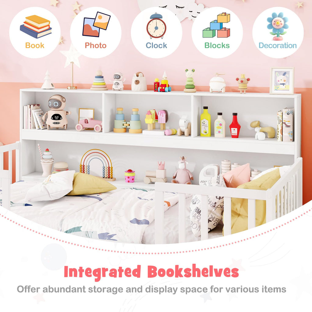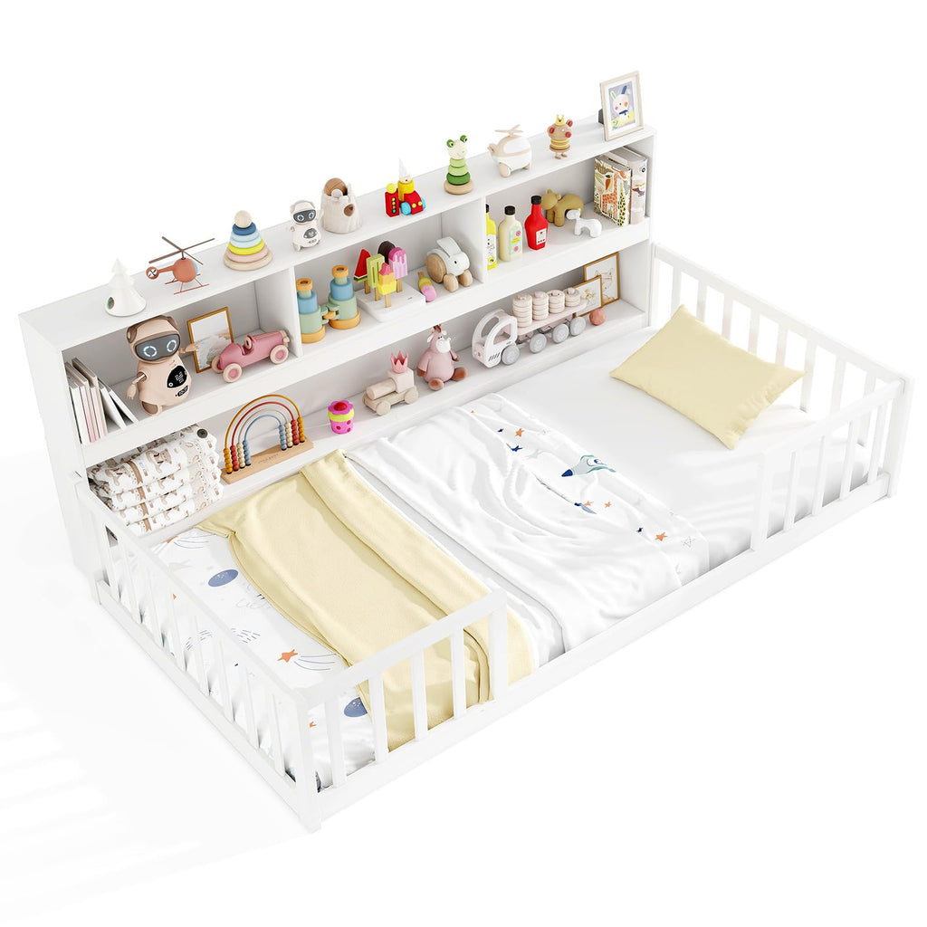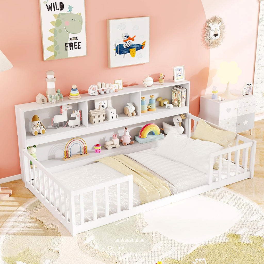 This elegantly crafted piece not only offers exceptional durability and fine craftsmanship but also features integrated bookshelves for storing and displaying your cherished items like books, blocks, and decorations. Its innovative 2-in-1 design provides a secure and peaceful sleeping environment and transforms easily into a creative playground for your toddler. The thoughtfully designed low height and surrounding safety fence ensure enhanced protection, while the wide entrance facilitates easy access. Easy to assemble with clear instructions, this bed frame is designed for both convenience and long-lasting use, making it an ideal choice for your home.