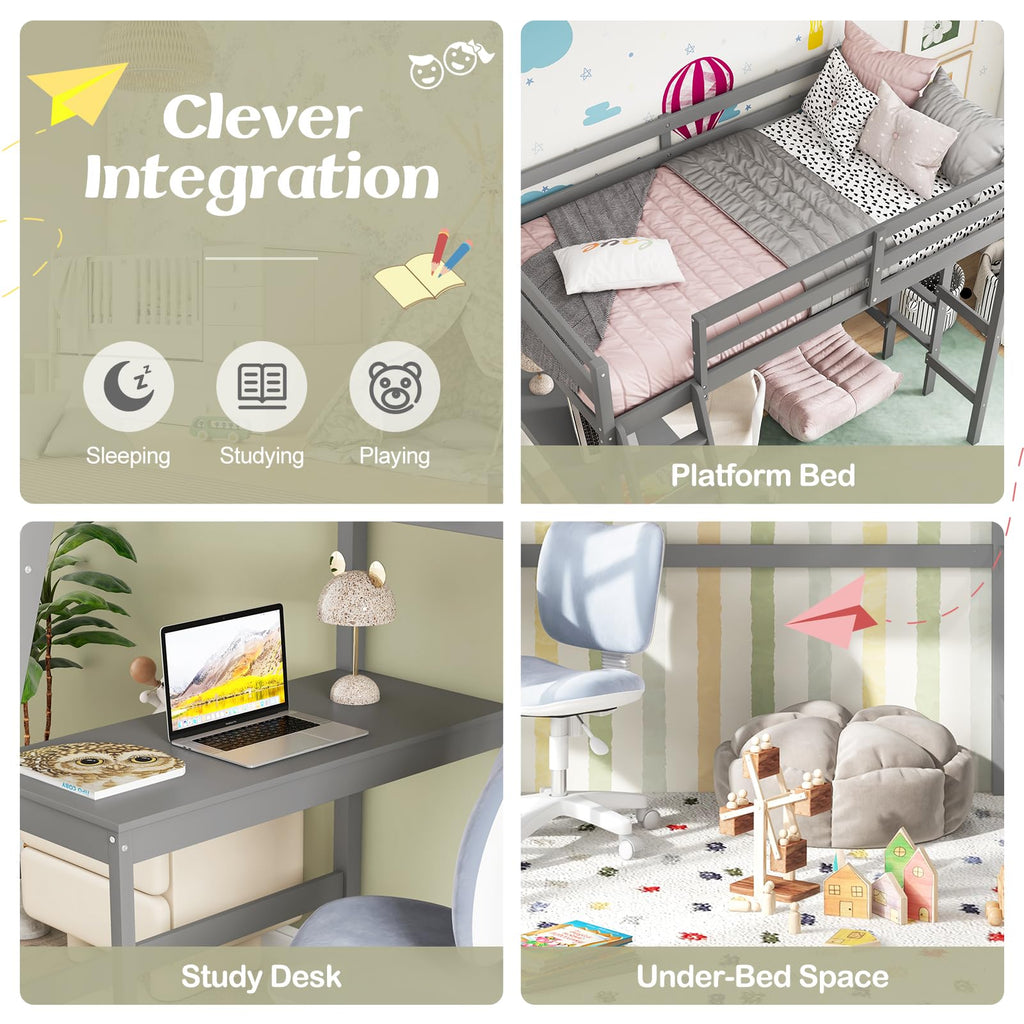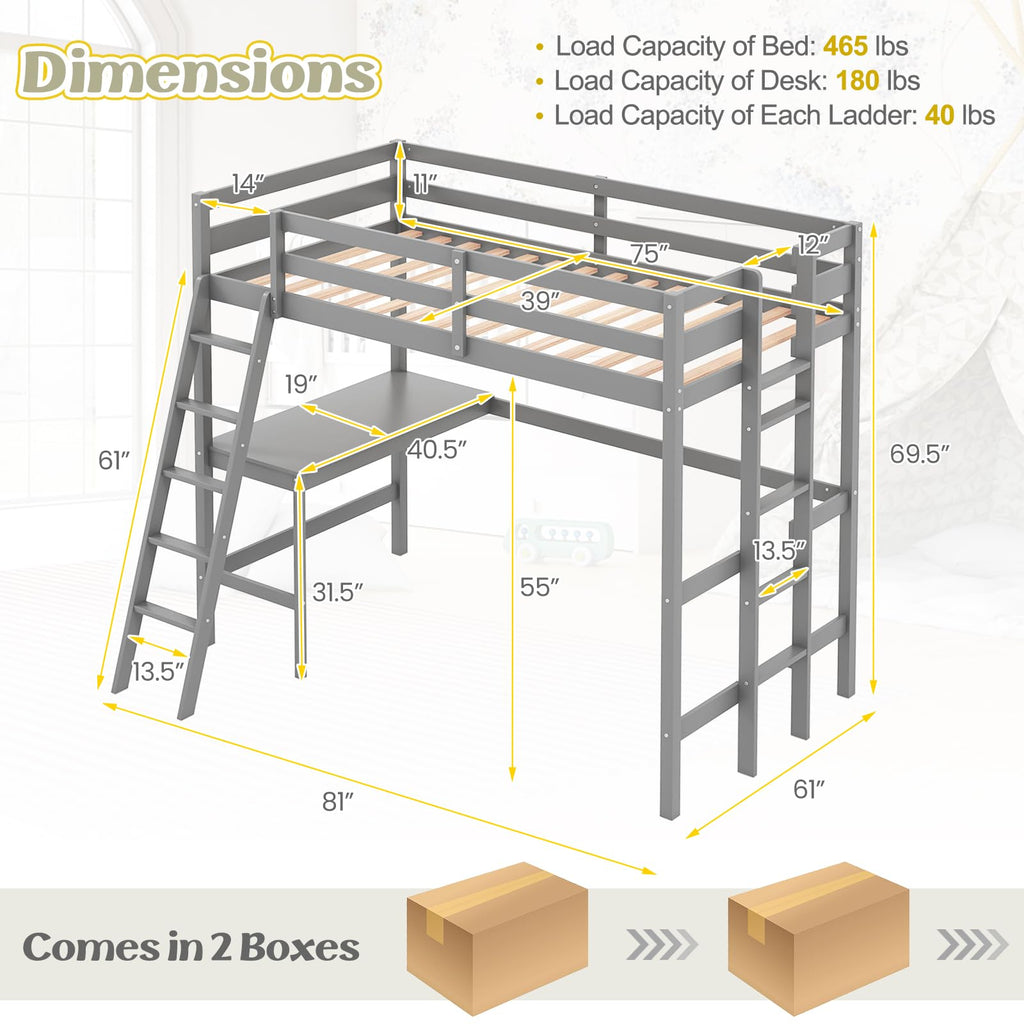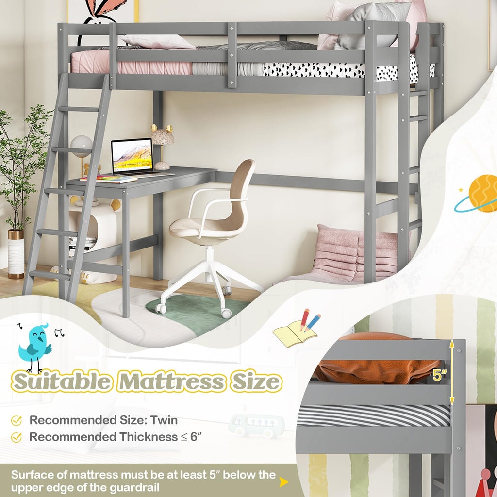 Enhance your child’s bedroom with this durable and space-efficient loft bed, which boasts a stable frame made from solid wood, offering a total weight capacity of up to 1525 lbs for ultimate peace of mind. Its 11” high guardrails provide unparalleled safety, and the included anti-tip kit ensures the unit remains securely in place. A built-in study desk below the sleeping area transforms it into an instant productivity nook. For ease of access, the bunk bed features 2 ladder options: a gently sloped ladder for a comfortable climb and a space-saving straight ladder. The loft bunk bed’s platform base is designed to support a twin mattress up to 6 inches thick, removing the requirement for a box spring and fostering a sleek look. Surface of mattress must be at least 5” below the upper edge of the guardrail. Looking forward to you discovering more premium details!
