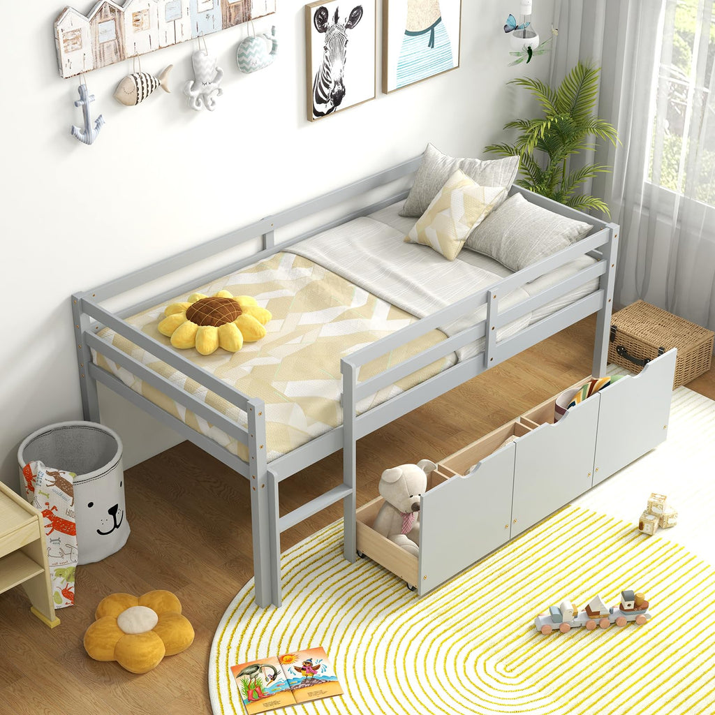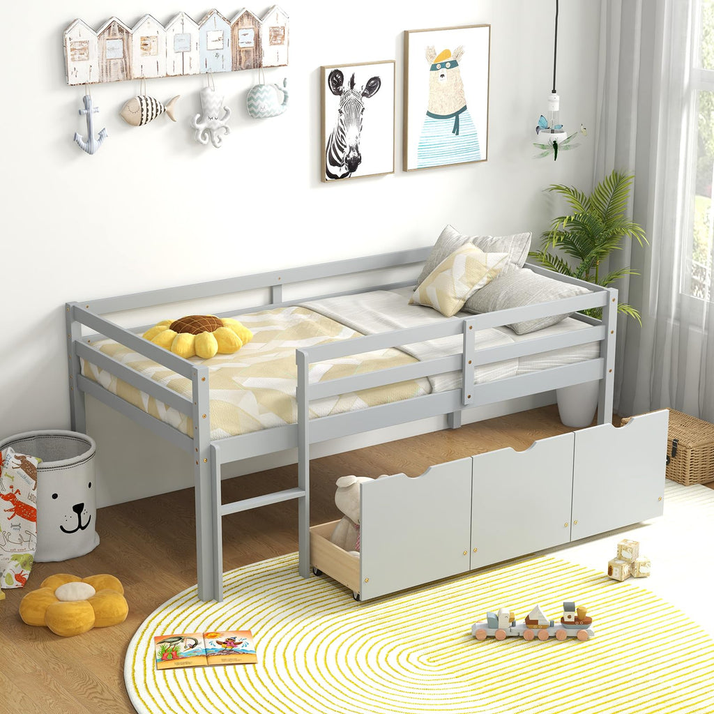 Discover the ultimate space-saving solution for sleeping area! Our twin loft bed offers a cozy sleeping nook and smart storage with 3 rolling drawers, keeping clutter at bay. Rest easy with a 14-inch guardrail and a low 20-inch platform, ensuring safety without compromising style. Watch your little one confidently climb the easy-access ladder, fostering independence. Crafted from robust wood, this timeless bed is a stylish, long-lasting addition to any bedroom. Make the smart choice for your child’s space - click to transform their room today!