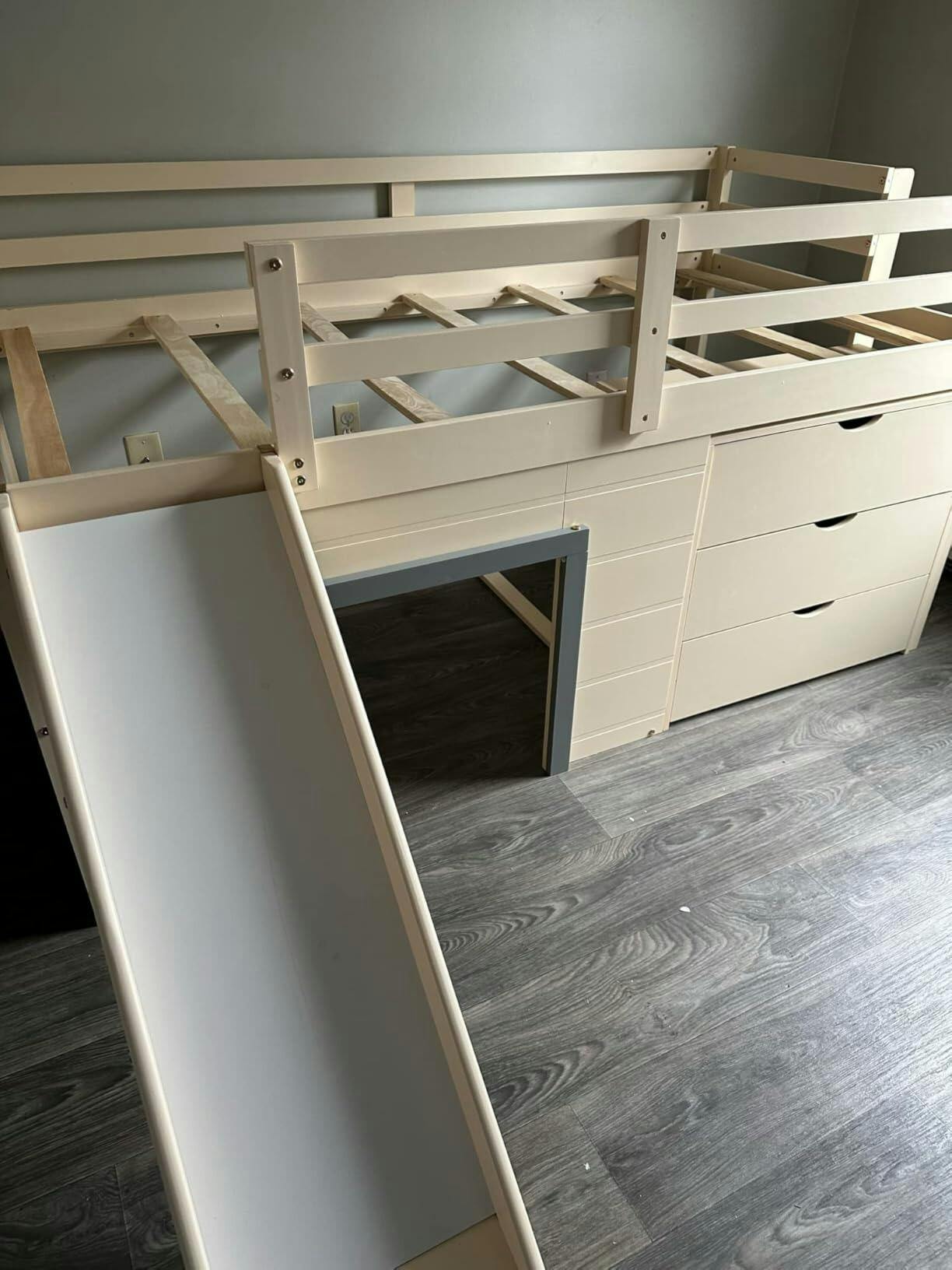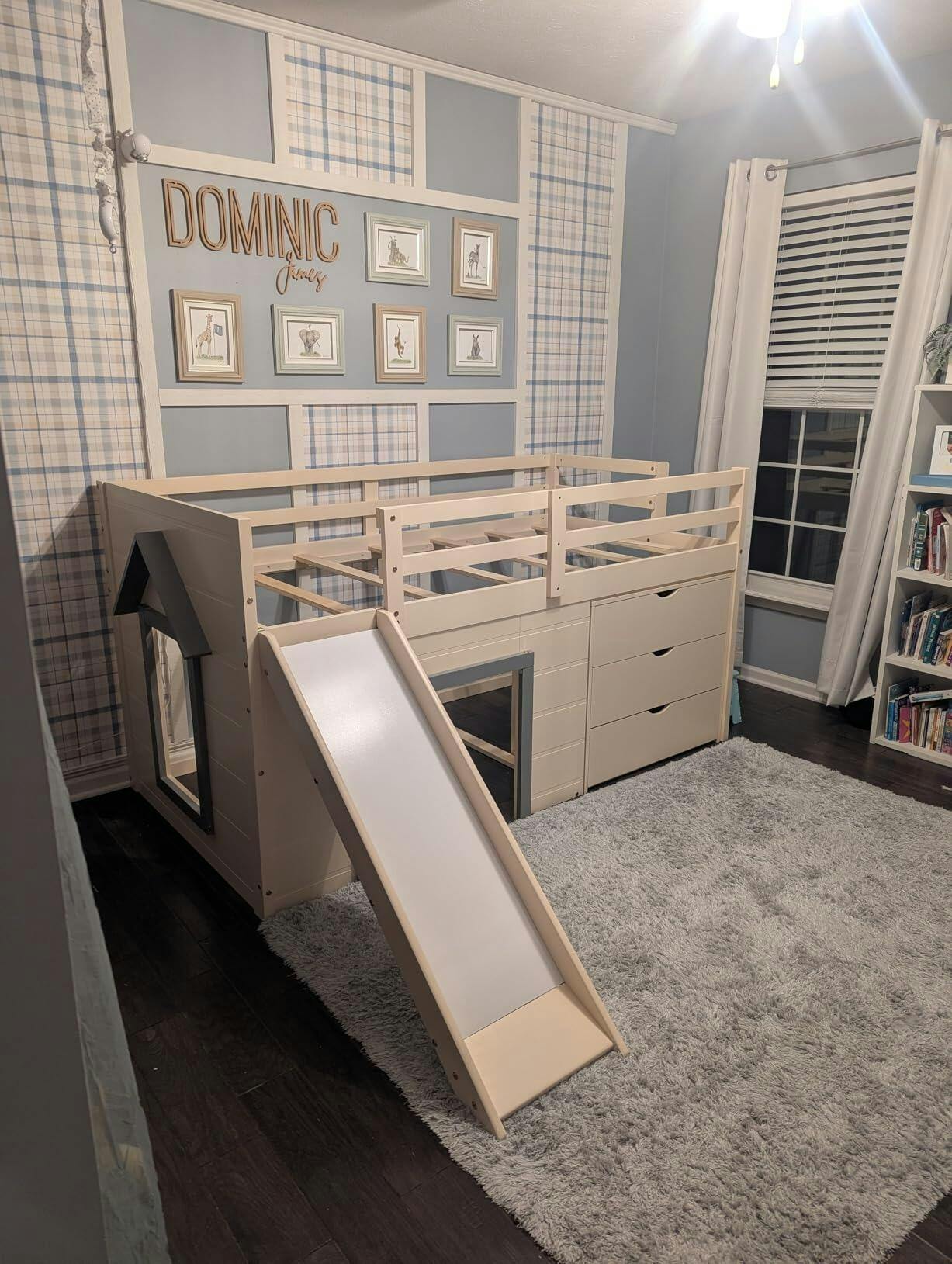This versatile loft bed provides a fun and safe sleeping space for children while also maximizing play and storage space. The twin loft bed has a slide that kid can slide down directly from the upper bed, combining entertainment and practicality. The low loft bed also comes with guardrails and a built-in ladder, making it easy for your child to get in and out of bed safely. The generous space under the bed will be the perfect play area or reading spot for your child. And there are 3 large drawers for storing children's toys and clothes. Featuring strong, solid pine wood frame and thick bed slats, this wooden loft bed is built to last for many years. With its modern design and stylish color scheme, this loft bed for kids teens is perfect for any home decor style.