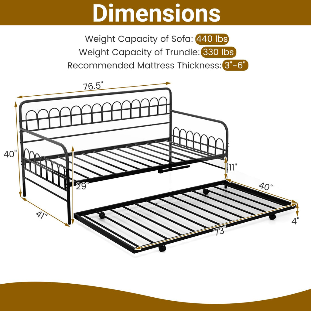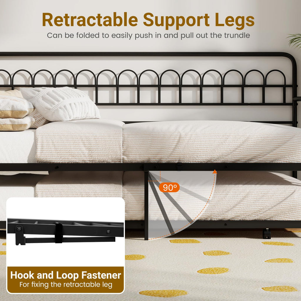 This versatile piece can be used as a cozy sofa by day and easily converts into an extra sleeping area at night, complete with a space-saving pull-out trundle on lockable casters. Boasting a robust metal frame with power-coated slats and sturdy guardrails, it ensures both durability and safety. The elegant minimalist design with its round arch patterns adds a touch of sophistication to any room, while up to 14" of under-bed storage provides ample space to keep your essentials organized. Ideal for any home needing flexible sleeping solutions and smart, chic furnishing, this daybed is the perfect addition to small apartments, guest rooms, or children's bedrooms.
