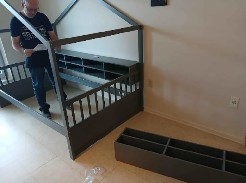 My son loves this bed. He couldn't wait to assemble it as soon as it arrived. Shipping was fast, and the packaging was very secure and heavy. Assembly wasn't complicated overall. The instructions were very clear, following each step step by step. The bed's wood panels are of good quality, and the screw holes are perfectly aligned. The bed size is perfect for my five-year-old son. There's also a four-compartment storage cabinet underneath, providing ample space for toys and other items. The overall assembly looks great; it will be even prettier once the lights are installed.