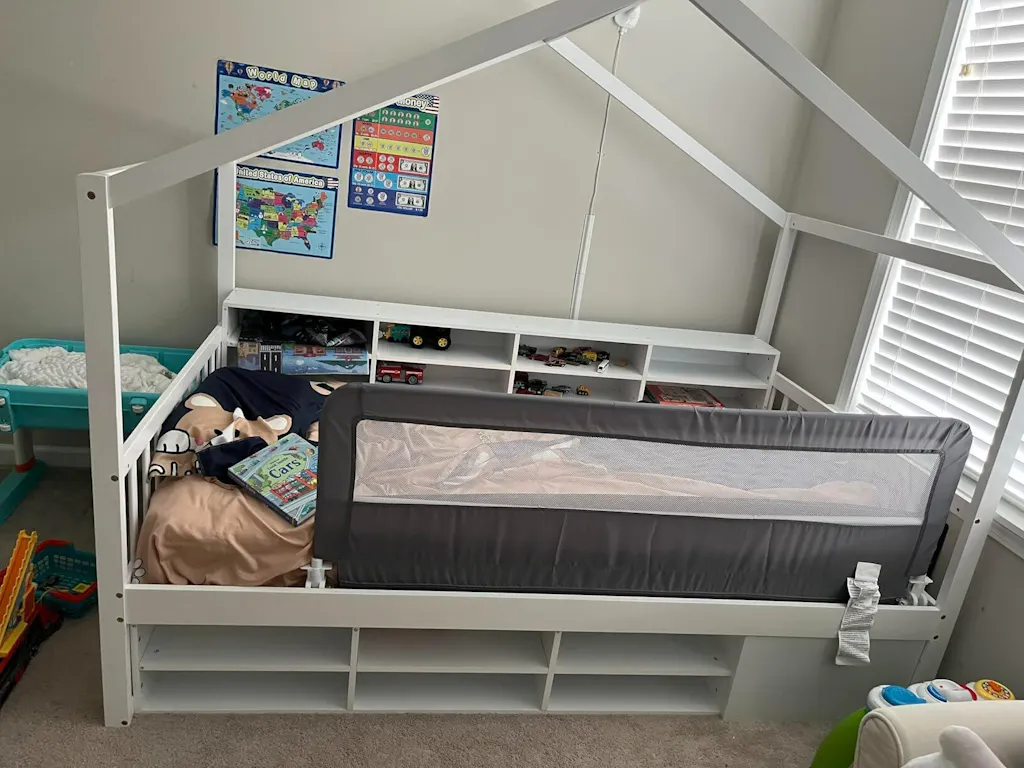 The surrounding rails are high enough to keep them from rolling out at night, which was my biggest concern. It’s low to the ground, so I don't have to worry about falls. The wood feels sturdy and the finish is smooth with no sharp edges. Plus, it looks adorable in the nursery without taking up too much visual space since there's no bulky roof. Highly recommend for anyone looking for a safe Montessori-style setup