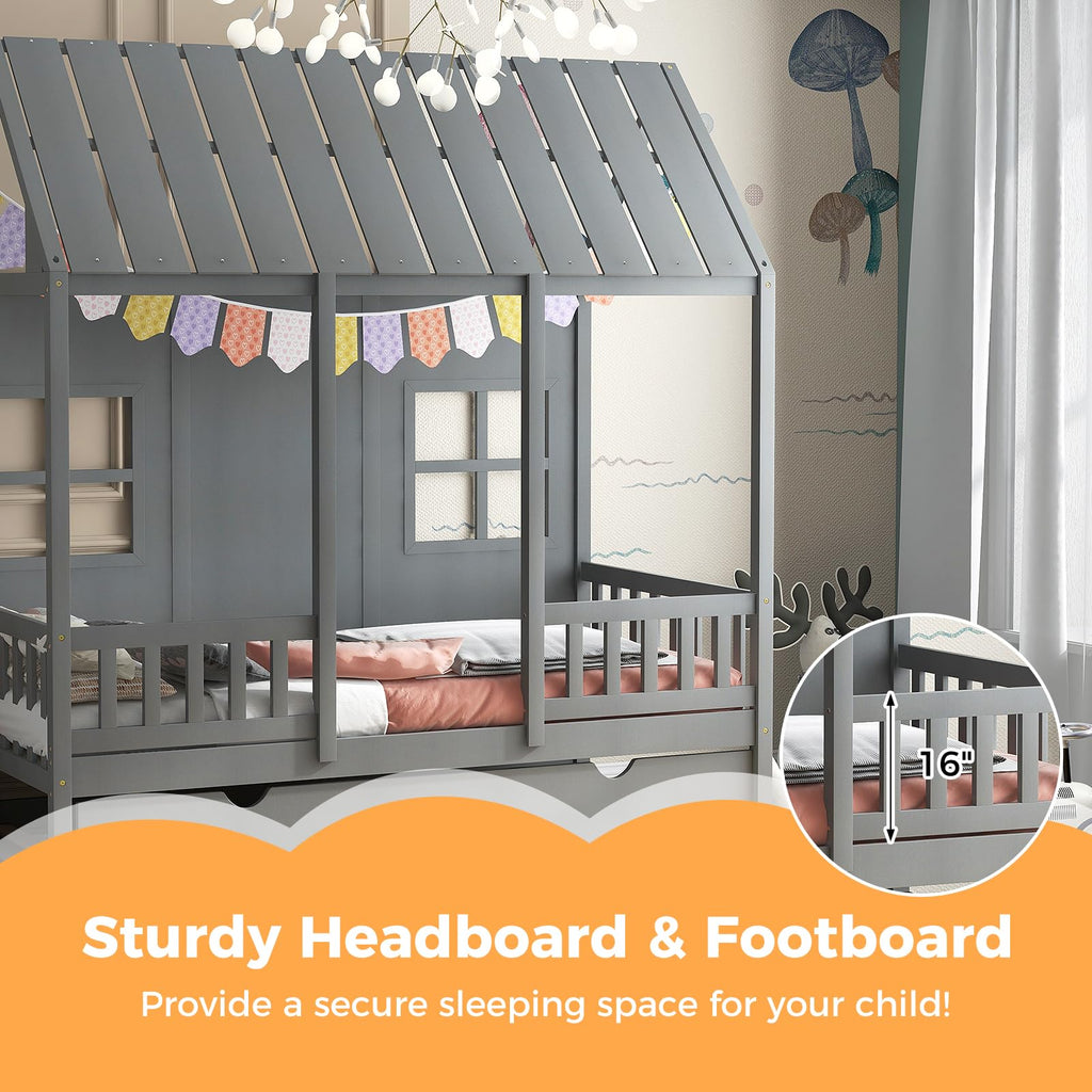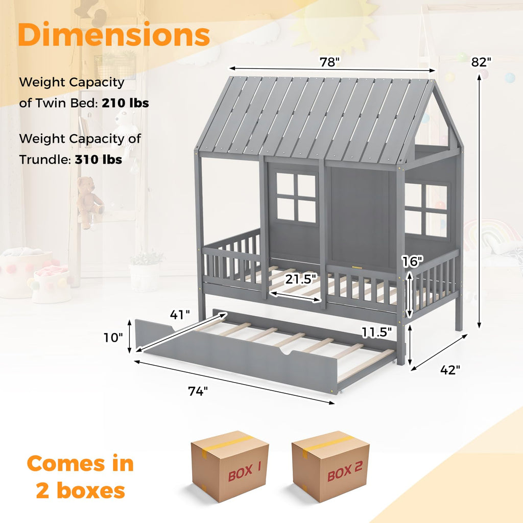Feature Crafted from solid wood with exquisite craftsmanship for long term use 10 + 7 wooden slats provide reliable support, eliminating the need for a box spring Pull-out trundle optimizes space while providing extra sleeping space Fence rails prevent falls, ensuring a safe sleeping environment for kids Sparks imagination and creates a cozy sleeping space House-shaped design with roof and windows to enhance the overall look Easy to adorn the roof with lights, curtains, or other decorations The low-profile frame allows children to climb in and out of bed easily