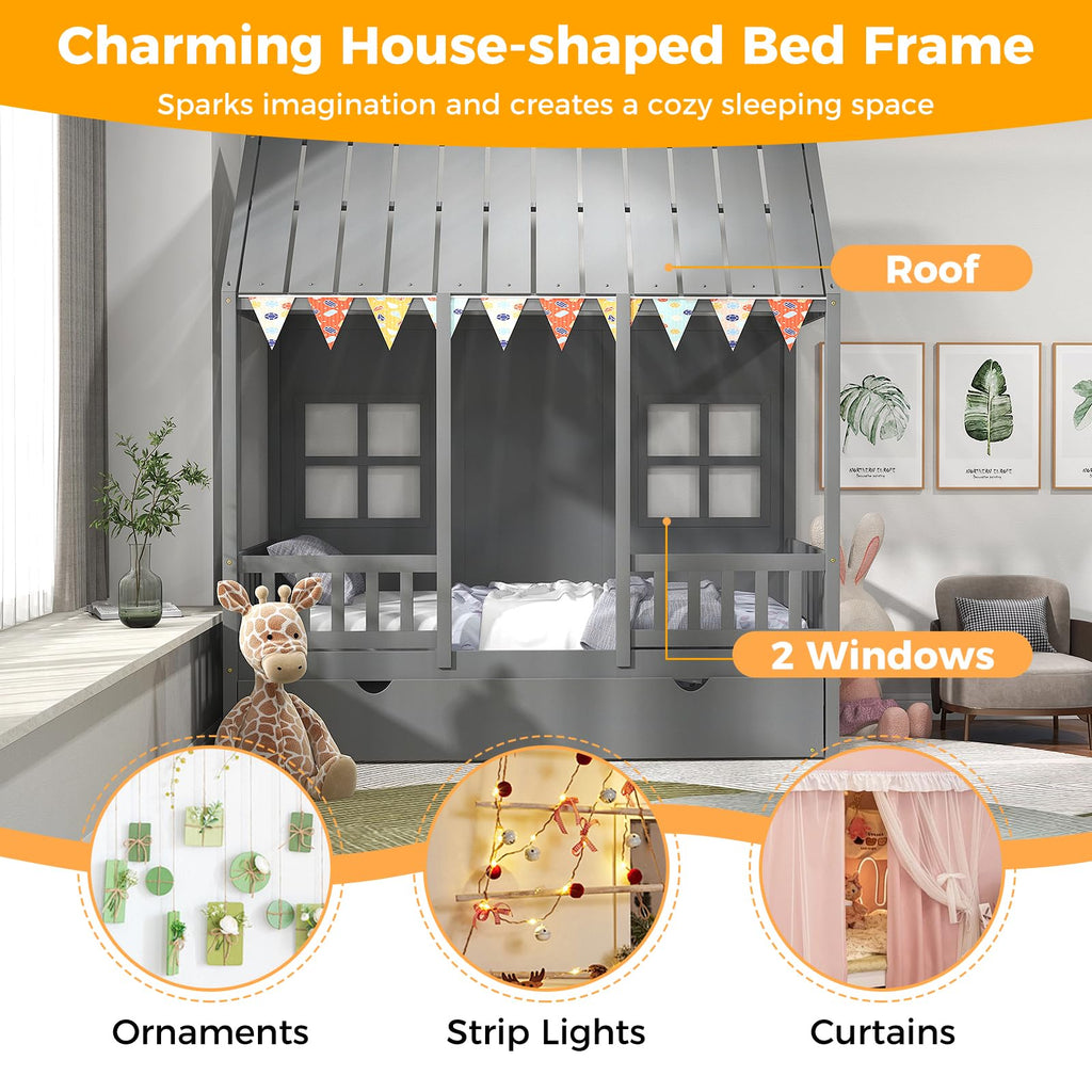 Enhance your child's bedroom with this twin-size house bed with trundle, designed to ignite children's imaginations and enrich their sleeping environment. This bed frame includes a space-saving trundle bed that provides an extra sleeping area for sleepovers or guests, making it ideal for growing families. Made from solid wood with sturdy bed slats, this twin bed frame offers reliable support and stability. Safety is paramount with the included fence rails, preventing accidental falls as children sleep or play. This wooden bed frame features a house shape with a roof, 2 windows, and fence rails, creating a fun and imaginative sleeping space for boys and girls. This charming house-shaped bed frame allows your child to create their dream bedroom while adding a stylish and playful touch to your home.