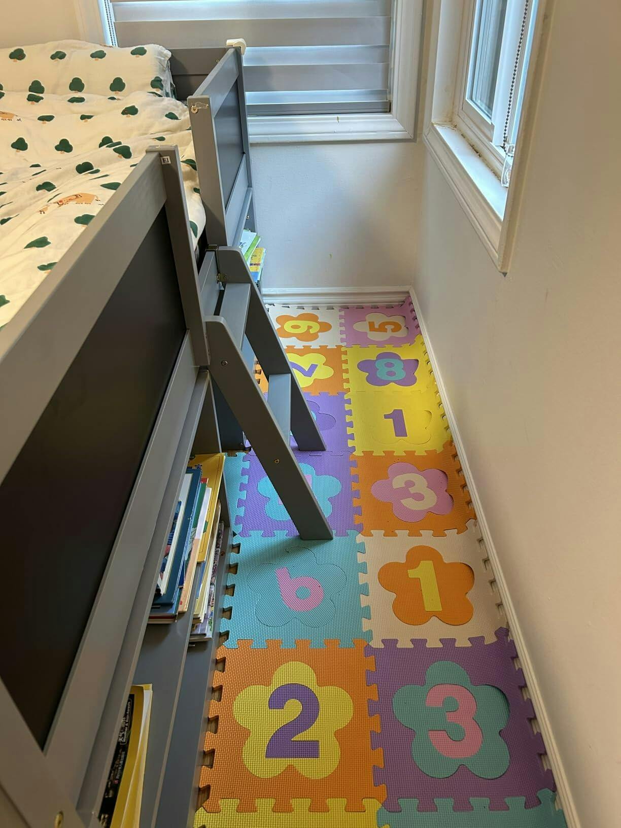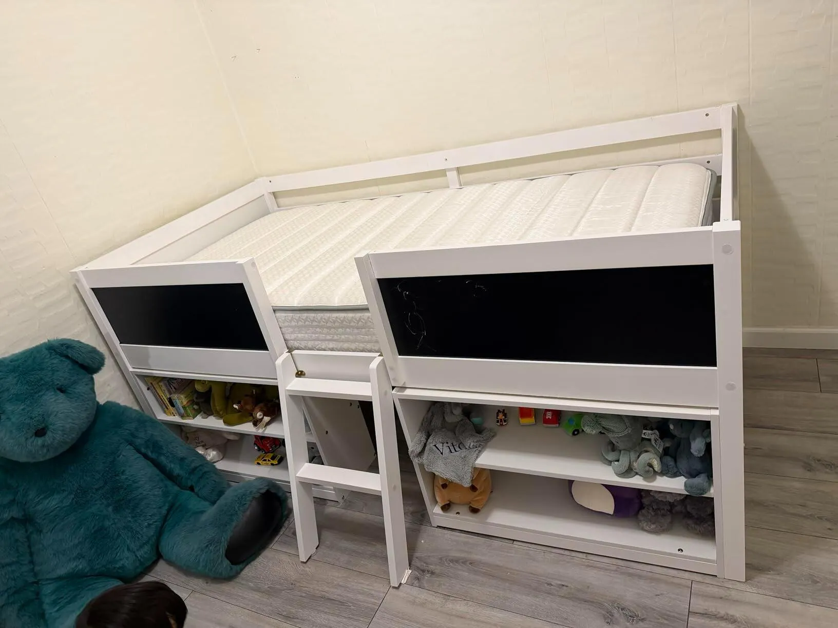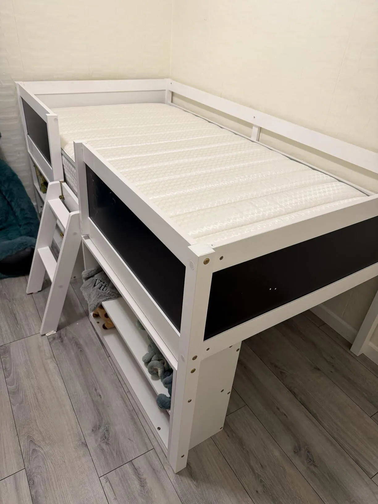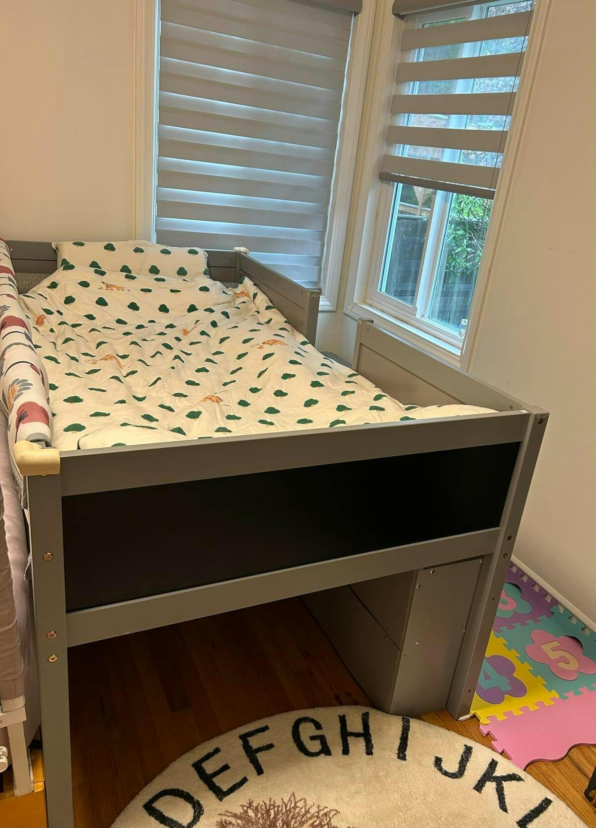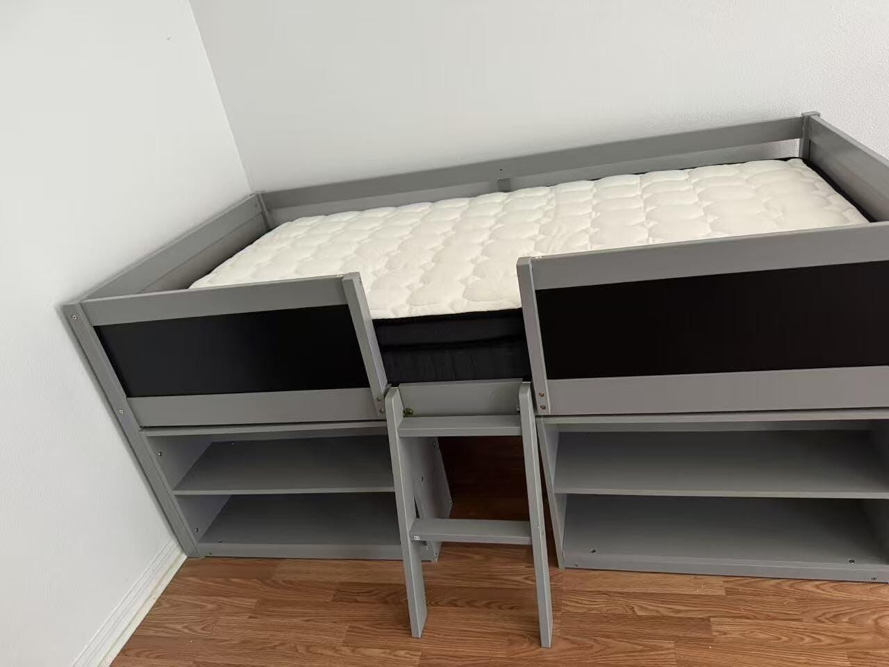 The white bed is very suitable for my son's room. He likes to put his favorite toys on the cabinet of the bed. He also likes to play hide-and-seek with his sister under the bed. With it, my son can finally sleep independently.