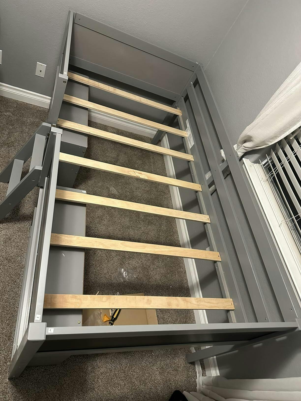 The bed frame is very durable bigger than I thought took about 2hrs to build all pieces are labeled the instructions were clear. Bed size says for twin mattress but I was able to fit a twin xl it’s very snug but I feel it’s savers for my 3 yr old.
