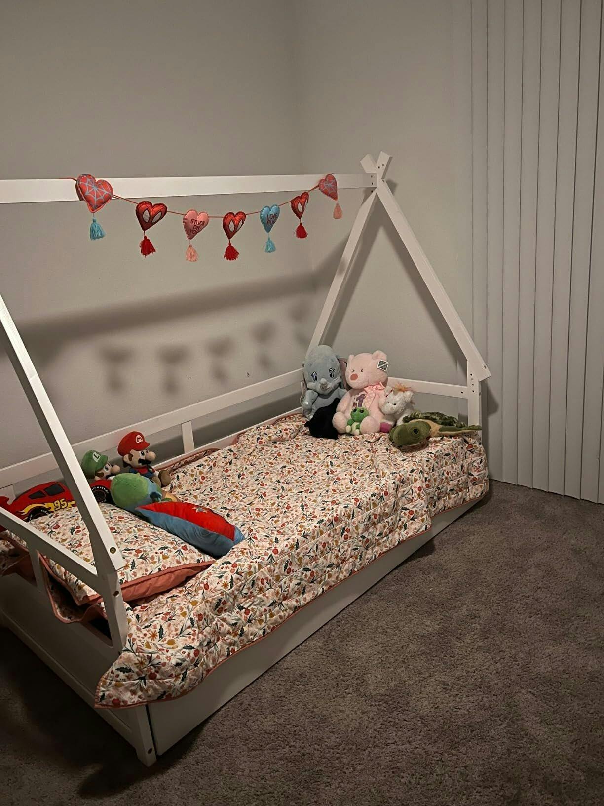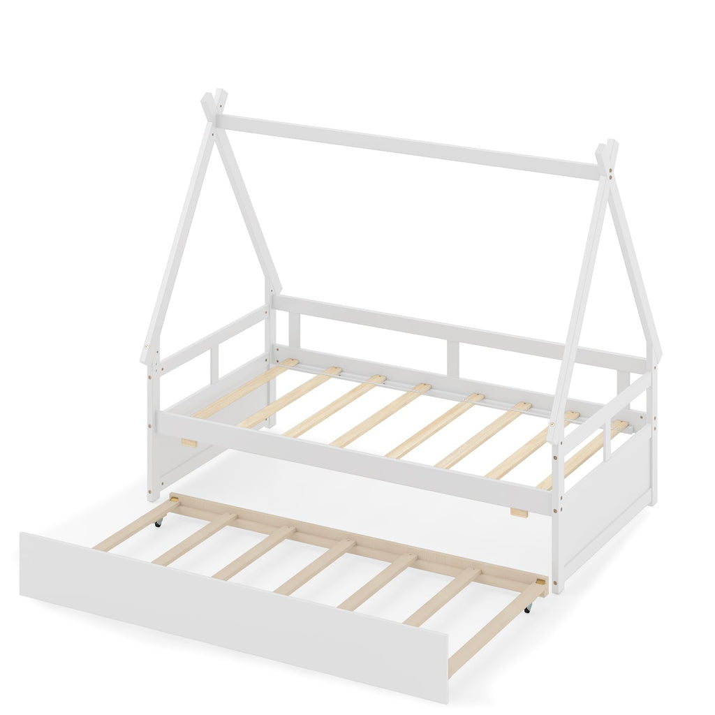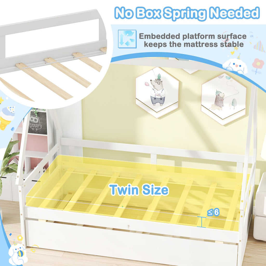 The house-shaped roof enables you to decorate the daybed with lovely flags, light strings, photos, and more, making it a lovely decoration. The bed frame features a slide-out trundle with smooth wheels, ideal for sleepovers or extra guests. Crafted with a robust wood frame and 15 sturdy plywood slats, the main platform bed supports up to 250 lbs, while the trundle can accommodate 200 lbs. Safety is a top priority with 9” guardrails and a secure embedded platform to keep your child safe while sleeping. Designed for a twin size mattress under 6” thick, this kids bed frame eliminates the need for a box spring, simplifying the setup process. Create a magical space for your child to sleep and play with this innovative house bed design.