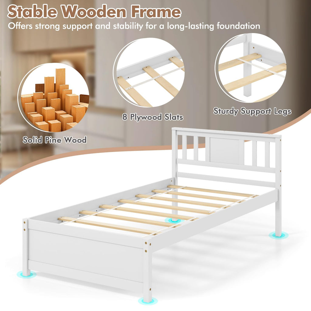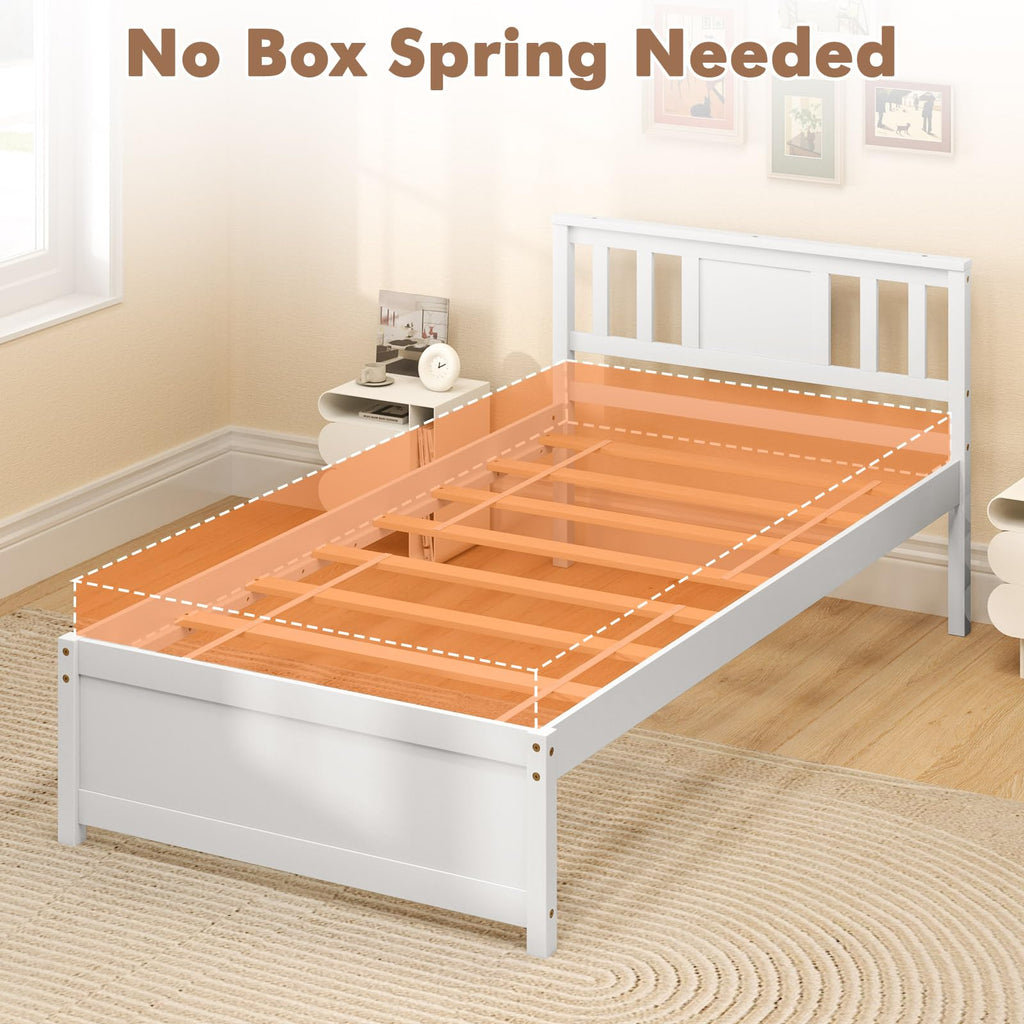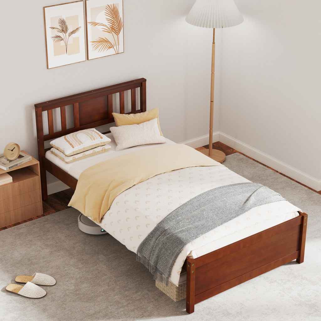 Designed in a timeless farmhouse style with a walnut finish, this twin/full/queen size bed frame effortlessly complements any bedroom decor. This solid wood bed frame includes sturdy support legs and 8 sturdy bed slats, offering exceptional stability and a weight capacity of 250/ 440 lbs. The reliable slat support system eliminates the need for a box spring. Besides, the slatted headboard adds a touch of sophistication but also ensures comfortable support. Beneath the bed, 12" clearance provide ample storage space for bedding, shoes, or seasonal items, maximizing room organization. This wooden platform bed offers versatility and durability, enhancing both style and functionality in your bedroom retreat.