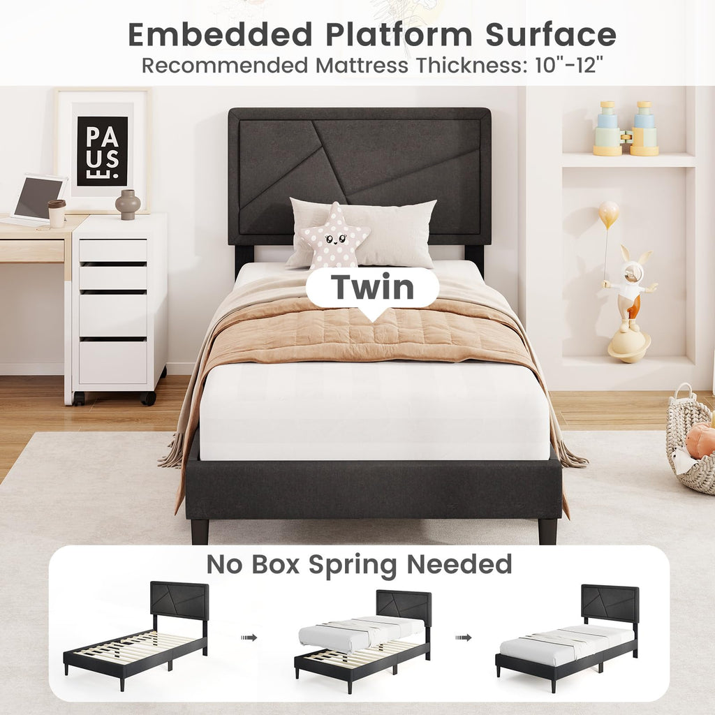 Transform your bedroom with this long-lasting bed frame. Featuring a chic tufted headboard and faux linen upholstery, this piece combines modern style with comfort. The elastic sponge padding ensures a cozy sleeping experience. In addition, the platform bed is supported by 12 sturdy plywood slats and reinforced legs, ensuring a large load capacity of 375/800 lbs. No box spring needed, thanks to the secure embedded surface that accommodates a 10"-12" thick mattress. The 6" under-bed space allows you to enjoy convenient sweeping.