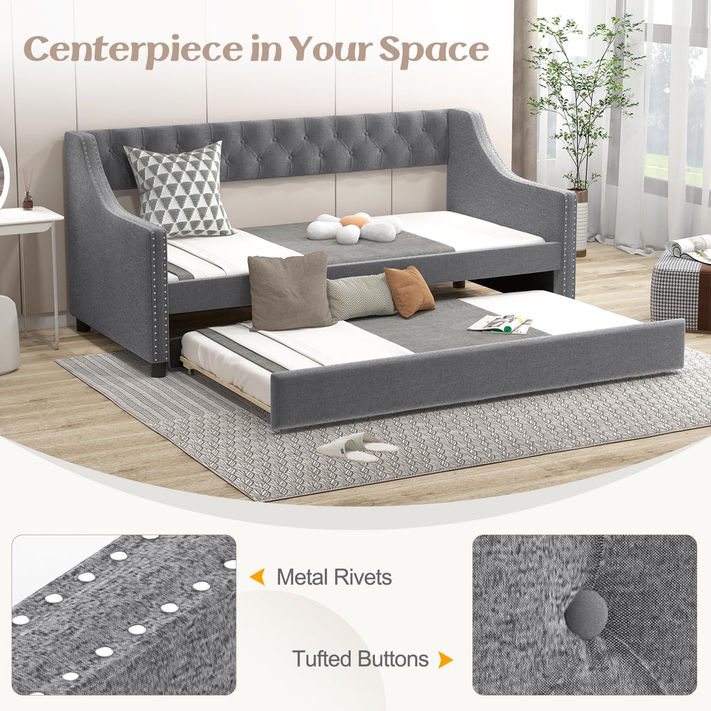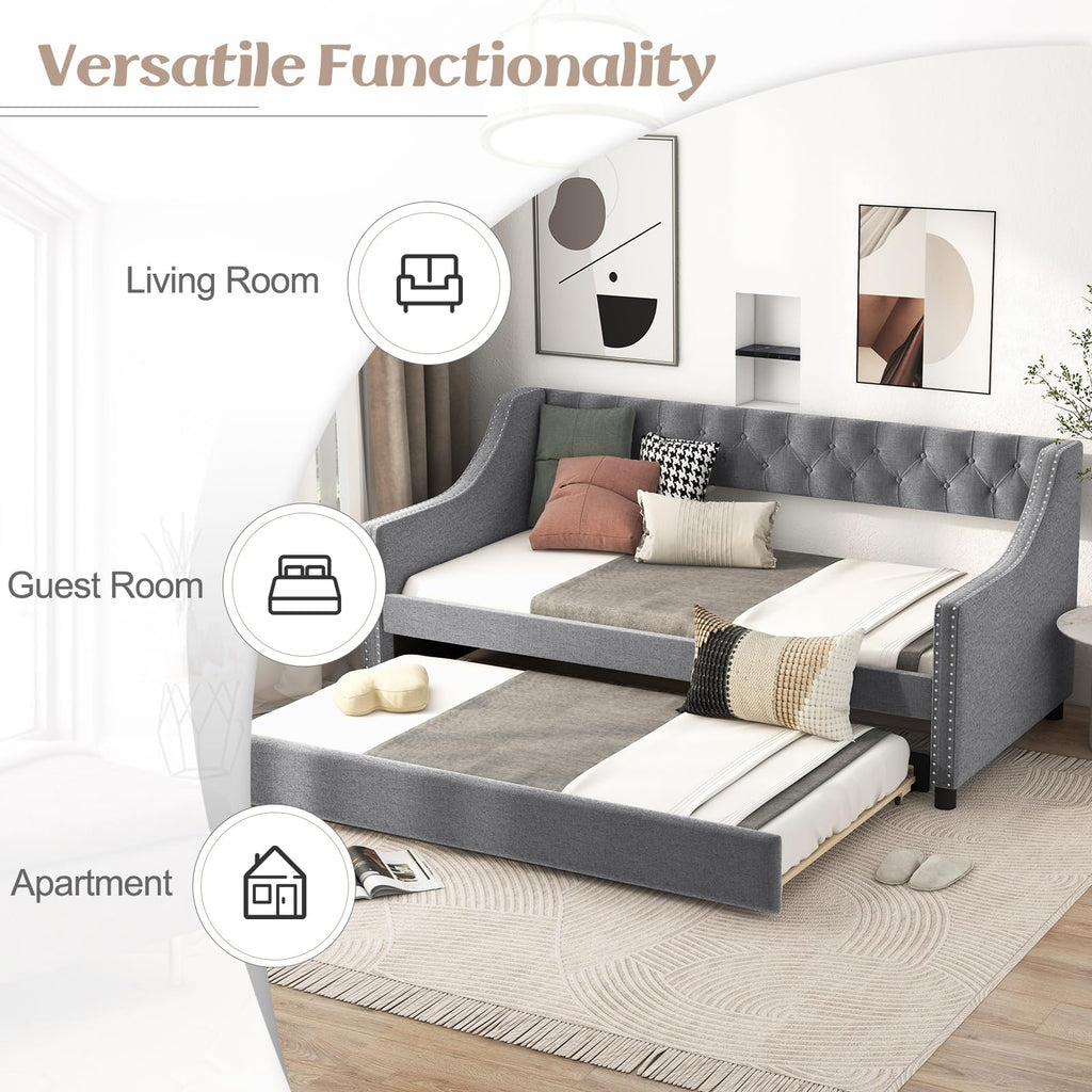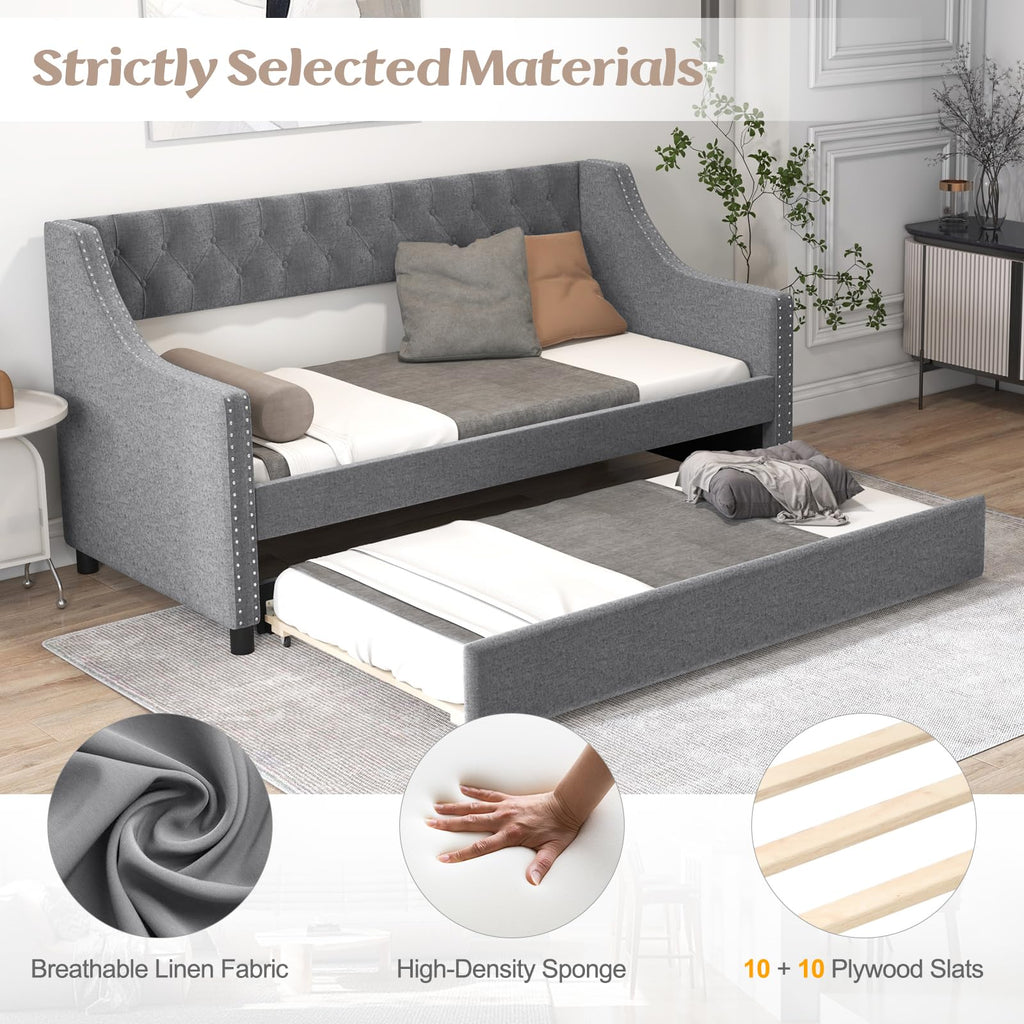 This space-saving marvel offers a pull-out trundle, maximizing floor space while providing additional room for a comfortable slumber. The daybed’s frame features thick sponge padding, elevating your sleeping experience to new heights. Crafted with tear-proof and breathable linen fabric covers, this trundle daybed strikes the perfect balance between durability and comfort. Stabilized by 10 + 10 sturdy slats, its frame can support an impressive load capacity of 600 lbs. Equipped with smooth-rolling wheels, the trundle glides effortlessly for seamless movement. Enhance your space with the elegant and stylish design, boasting rivets and tufted buttons that create an inviting atmosphere for your guests. From daytime lounging to nighttime dreaming, this versatile daybed with trundle is a welcome addition to living rooms, dorms, and apartments alike. The suitable mattress thickness for this remarkable daybed is 4”-5”.