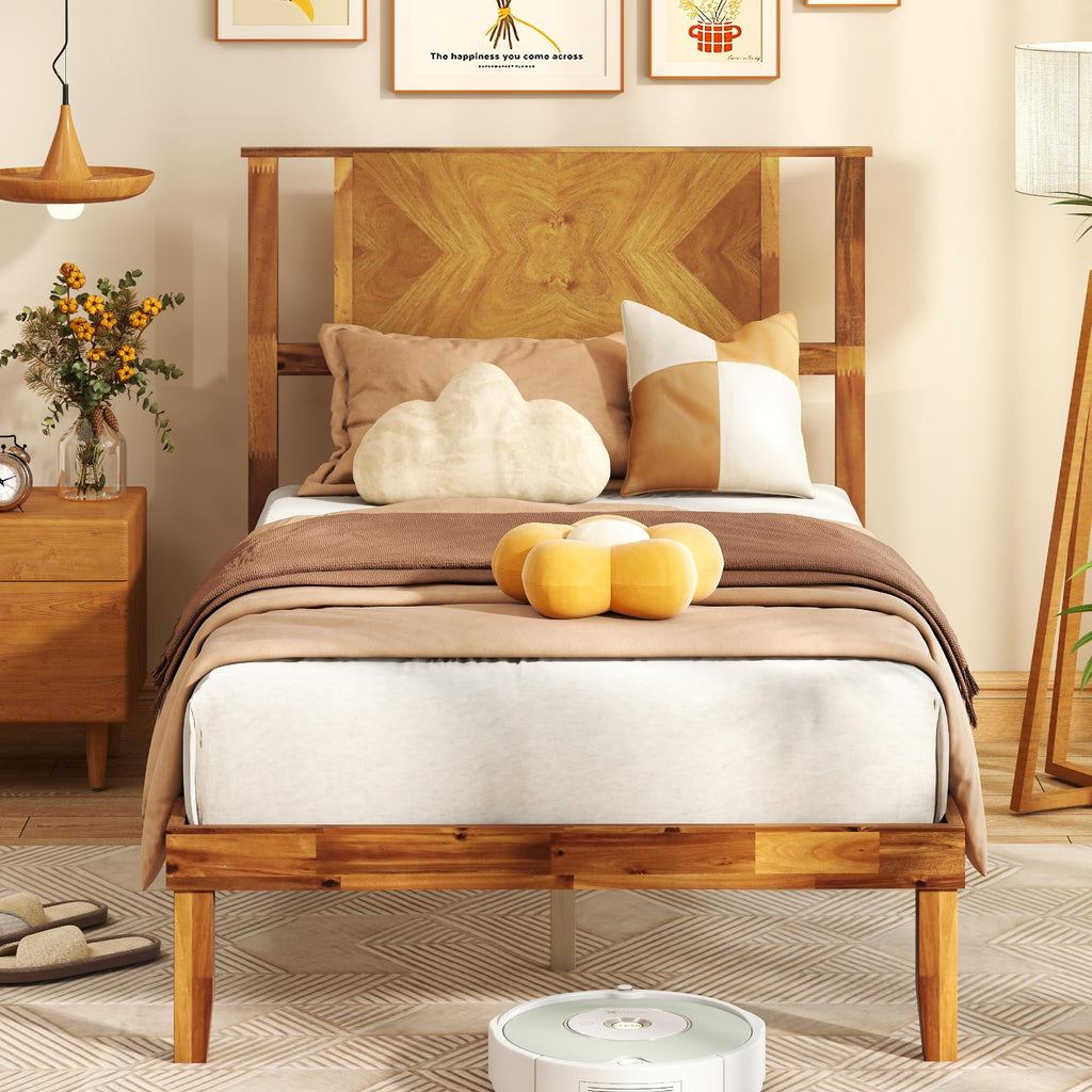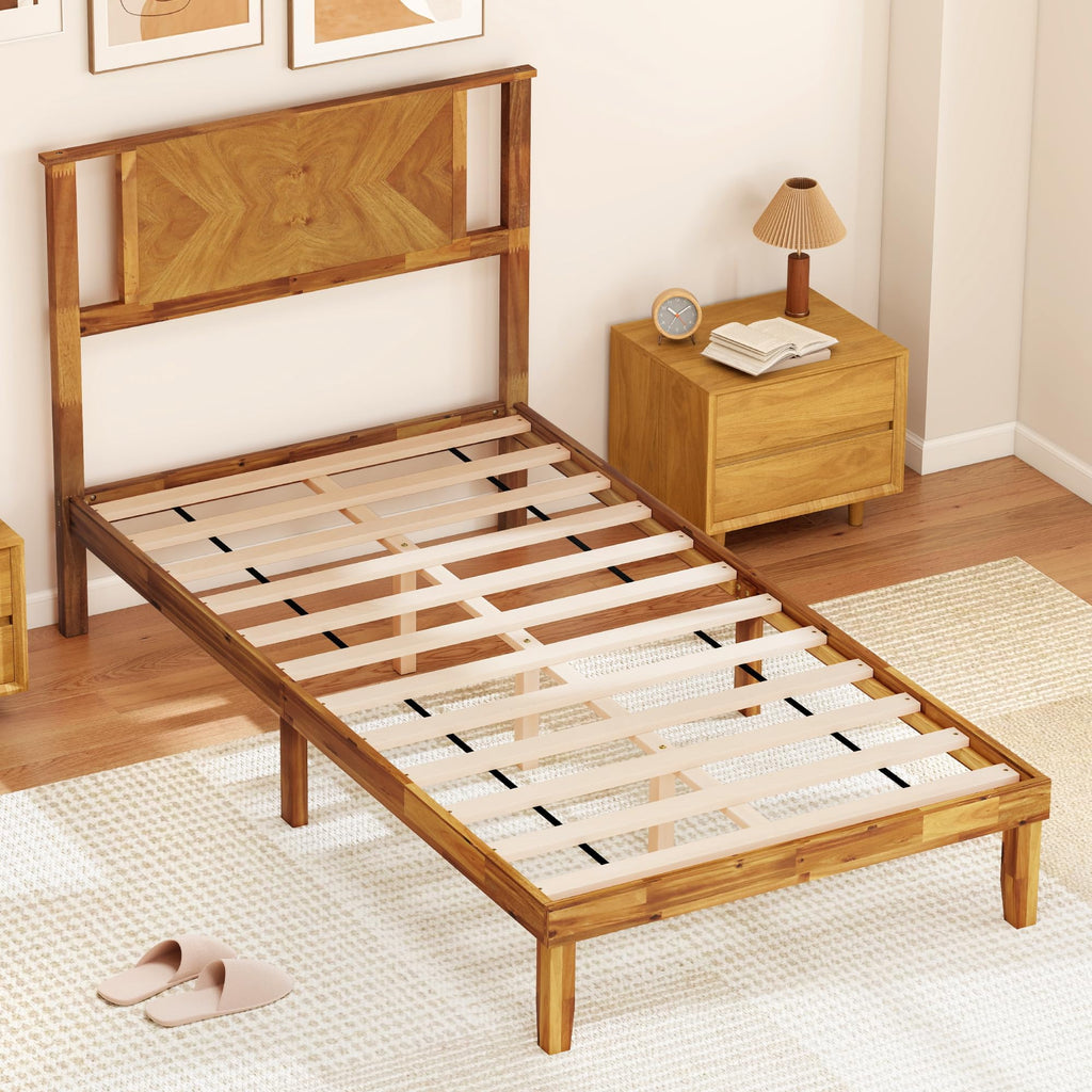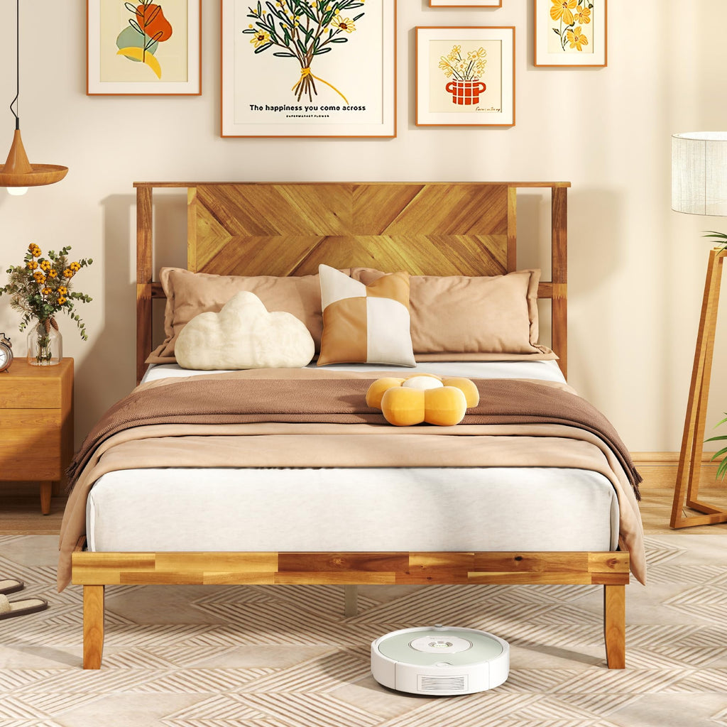 Elevate the aesthetic of your bedroom with this exquisite mid-century modern headboard and footboard, designed to seamlessly complement various decor themes. Crafted from premium acacia wood and MDF, this bed frame guarantees long-lasting durability and reliability, supporting weights of up to 550/800 lbs effortlessly. Experience a peaceful night's sleep without the need for a box spring, thanks to the 12 supportive plywood slats that offer a sturdy mattress foundation. Keep your living space organized and clutter-free with the generous 8.5" under-bed storage space, perfect for storing luggage, shoes, or other essentials. The thoughtful details, such as adjustable foot pads for balance on uneven surfaces and floor protection, ensure both functionality and aesthetics. Revel in the warmth and charm brought by the unique woven texture of the headboard, enhancing the overall ambiance of your room. Experience the perfect blend of style, functionality, and comfort with this rustic-style bed frame.