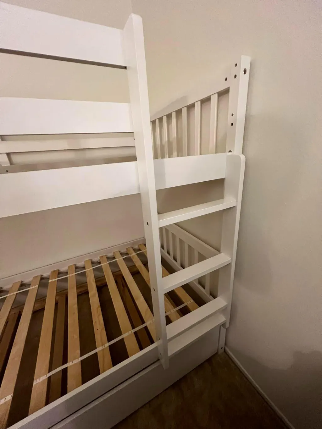 This bunk bed features a 3-step ladder and guardrails on the top bunk for added security and durability.