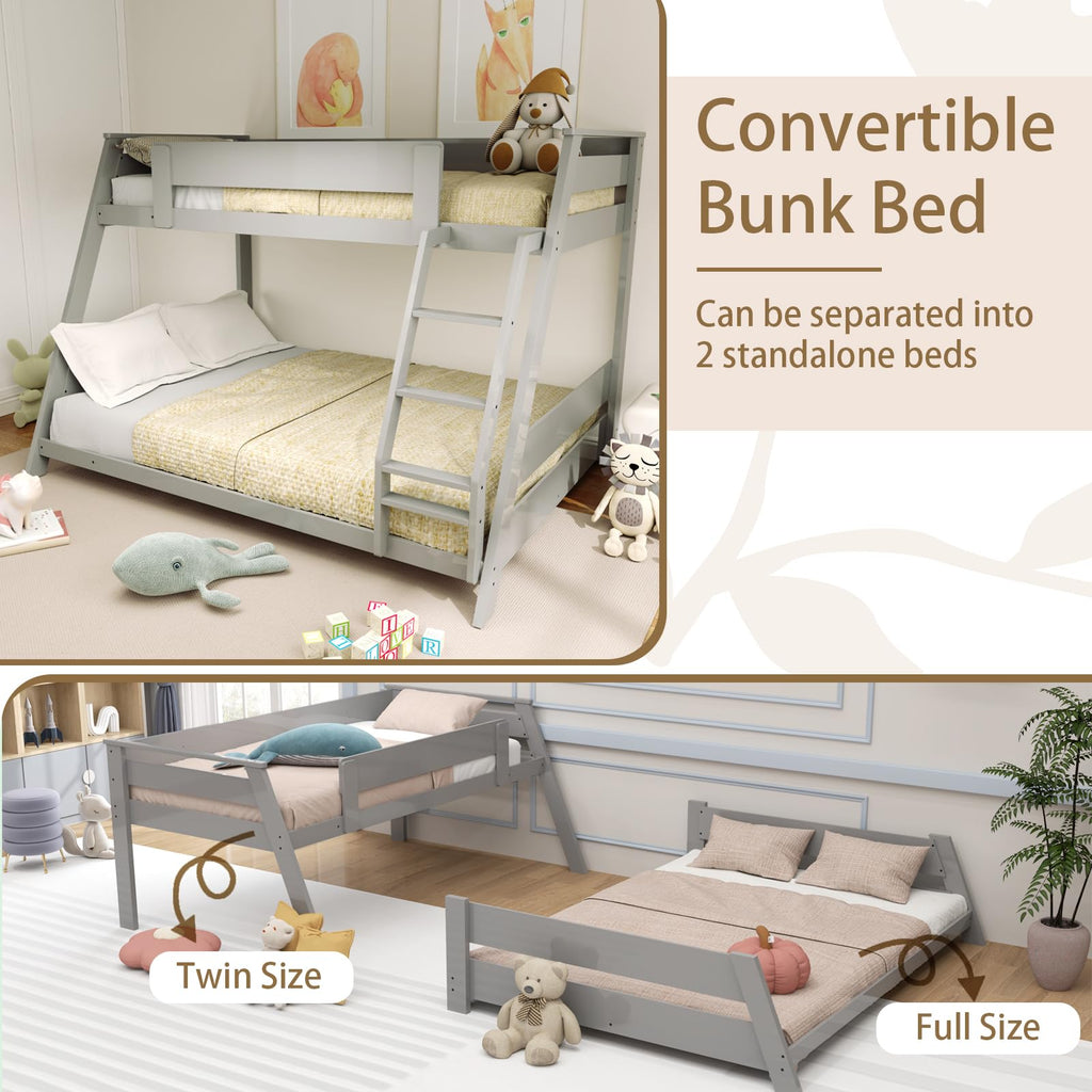 Description: Maximize your space with this twin over full bunk bed. This versatile, space-saving bunk bed allows easy conversion into 2 separate beds for growing kids. Crafted from natural wood, this bunk bed offers high strength and excellent durability. Its low-profile design makes it perfect for young children, while full-length safety guardrails provide added protection against falls. The versatile, reversible ladder can be installed on either side, offering easy access to the top bunk. With no box spring needed, the low bunk bed offers strong mattress support with built-in slats, making it both practical and stylish. Ideal for growing kids, teens, or adults, this convertible bunk bed maximizes space without sacrificing safety or comfort.