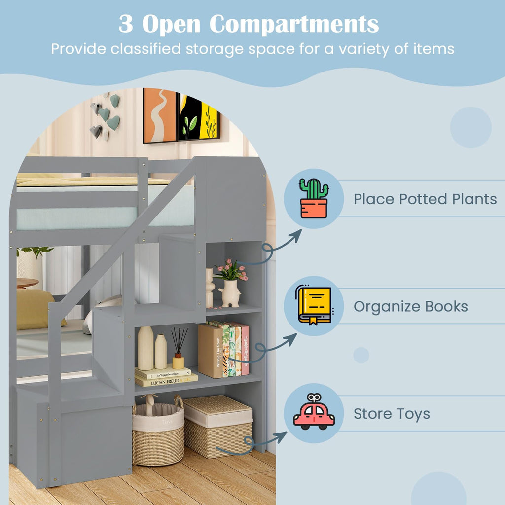 Crafted from a solid wood frame, the sturdy bunk bed promises lasting stability and support, featuring 14 + 7 plywood slats that eliminate the need for a box spring. The integrated storage staircase provides ample room for toys and essentials, promoting organization and tidiness. Safety is prioritized with 12.5” full-length guardrails, ensuring a secure sleeping environment. This twin over full bunk bed accommodates children, teens, and adults, making it ideal for family gatherings or sleepovers. Its modern aesthetic enhances any bedroom decor while maximizing vertical space, perfect for bedrooms or dorms. Upgrade your home with this stylish, space-saving, and secure sleeping solution today!