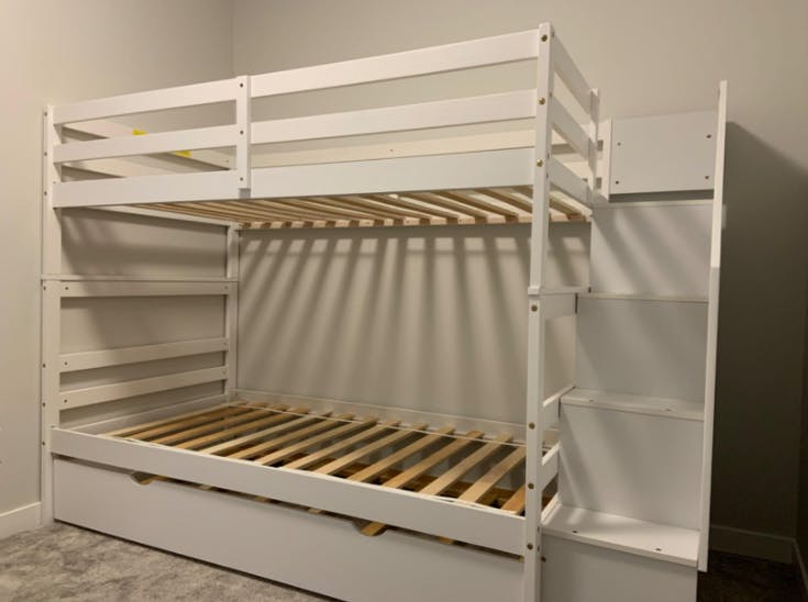 - [Easy to Assemble Bunk Bed] Measuring 93.5"L x 37.5"W x 66"H, our twin bunk bed is designed for ease of assembly. Mattress not included. Clear instructions and tools are provided to simplify the assembly process. Note: The recommended mattress thickness for the upper bed shouldn't exceed 6 inches, for the bottom bed should be between 6 to 8 inches, and for the trundle bed should not exceed 6 inches.