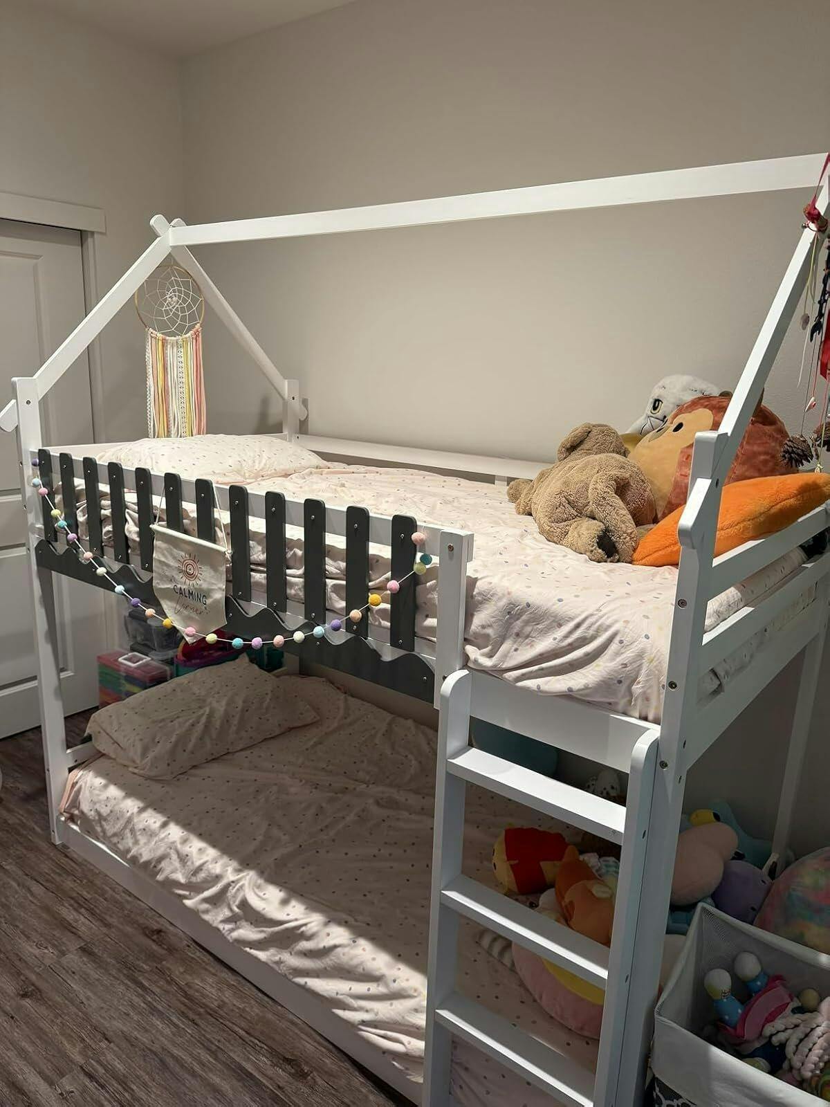 Space-Saving Solution: With a twin over twin configuration, this compact house bunk bed maximizes floor space while providing ample sleeping area for siblings or friends, making it perfect for sleepovers. With a stylish, modern look, it is ideal for a kids’ room, guest room, or summer camp. Description Upgrade your child's room with this charming and sturdy twin over twin house bunk bed. This bunk bed features a charming house shape that sparks imagination and adds a touch of fun to any bedroom. Crafted from solid wood, this low bunk bed is designed to provide a safe and stable sleeping solution for kids and teens alike. Safety is paramount, with 14-inch guardrails, protective fences, and a built-in ladder ensuring peace of mind. Its low-to-ground design allows easy access for younger children, while the slat support eliminates the need for a box spring. The twin over twin design maximizes floor space, making it ideal for smaller rooms or shared bedrooms. Whether for siblings or sleepovers, this space-saving and stylish bunk bed is a versatile choice for any child's bedroom.