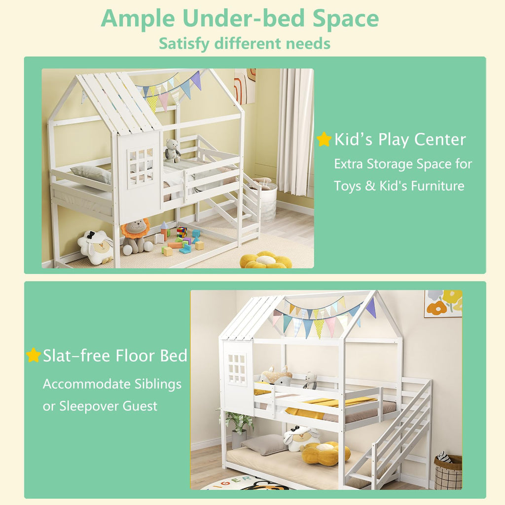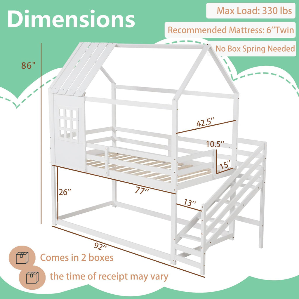 Description Discover the magic of dreamland! Transform your child’s bedroom into a charming cottage with our creative house bed! Designed as a captivating twin-over-twin bunk bed, it features a whimsical house frame with a roof and window, perfect for inspiring playful imaginations. Underneath lies a versatile space perfect for sleeping or playtime adventures, easily customized with lights and decorative items for a personal touch. Crafted with sturdy pine wood and strong enough to support up to 330 lbs, this bunk bed ensures safety with a solid 14-slat platform and a handy 4-step ladder guarded by a full-length rail. Fits standard twin mattresses and adds a sleek, magical touch to any room, no box spring required! Make bedtime exciting and safe with this enchanting loft bed!