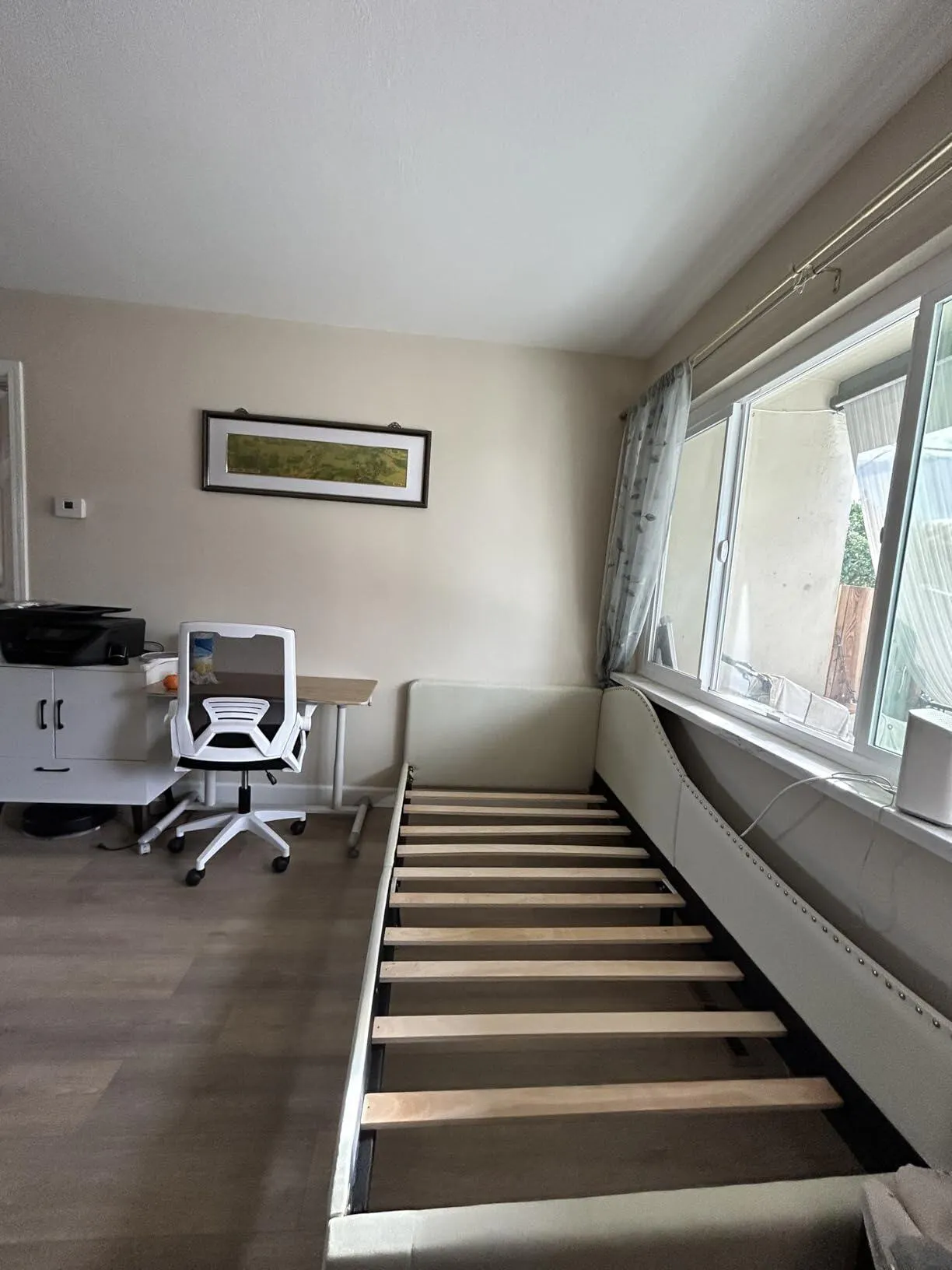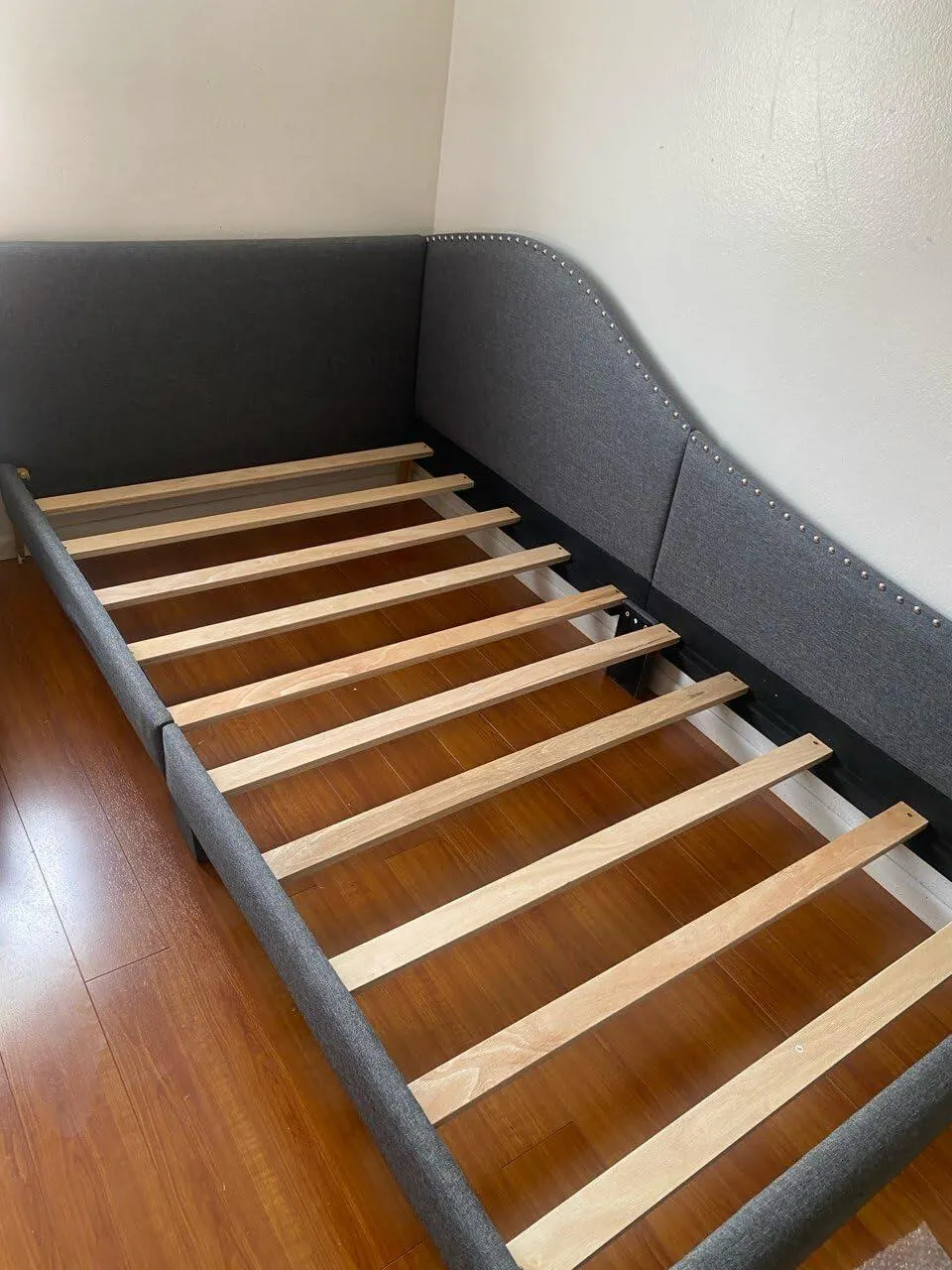 Practical Under-Bed Clearance: The upholstered daybed features a 6-inch elevated design, which facilitates easy sweeping. Therefore, the bed is perfect for those who value cleanliness and simplicity in home maintenance Description: The twin size daybed can be easily transformed into a comfortable sofa. Its elegant rivet-tufted design adds a touch of sophistication. Built with a sturdy structure, including 10 plywood slats and robust metal legs, the bed frame can support up to 350 lbs. Wrapped in long-lasting linen fabric and filled with elastic sponge, the upholstered bed offers a cozy sleeping space. With no need for a box spring, the platform bed frame is designed for 6"-8" thick mattresses. Its 6-inch under-bed clearance simplifies cleaning. More user-friendly details await your discovery.