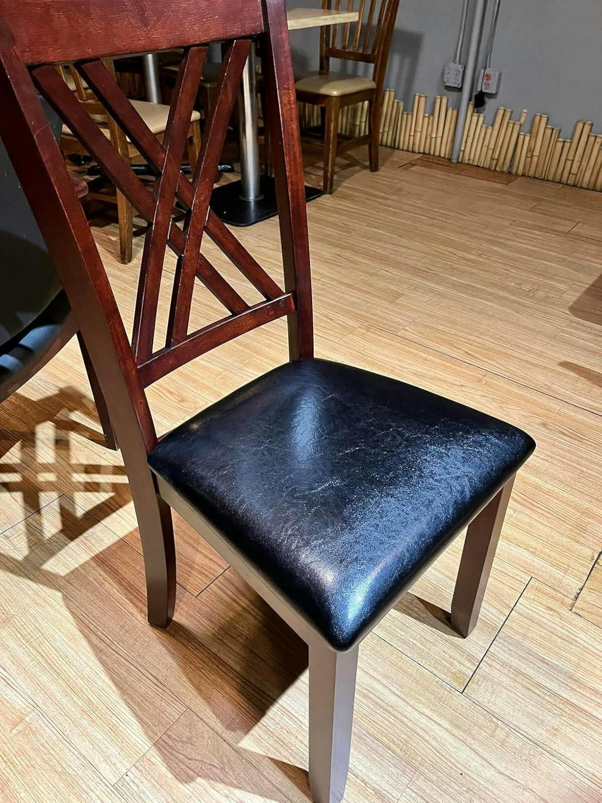 Enhance your dining area with a set of cozy dining chairs. With a considerate design, each kitchen chair features a 22'' high backrest and a 5'' thick seat that reduce sedentary discomfort. Upholstered in durable PVC leather, they offer a skin-friendly touch that is easy to maintain. The chairs are filled with ultra-soft sponge for added elasticity and fatigue relief. With rubber wood legs and anti-slip foot pads, they provide stability and can support up to 355 lbs. The vintage style is accentuated by the black seat, brown wooden frame and decorative double X-shaped frames. Installation is a breeze, thanks to the user-friendly manual.